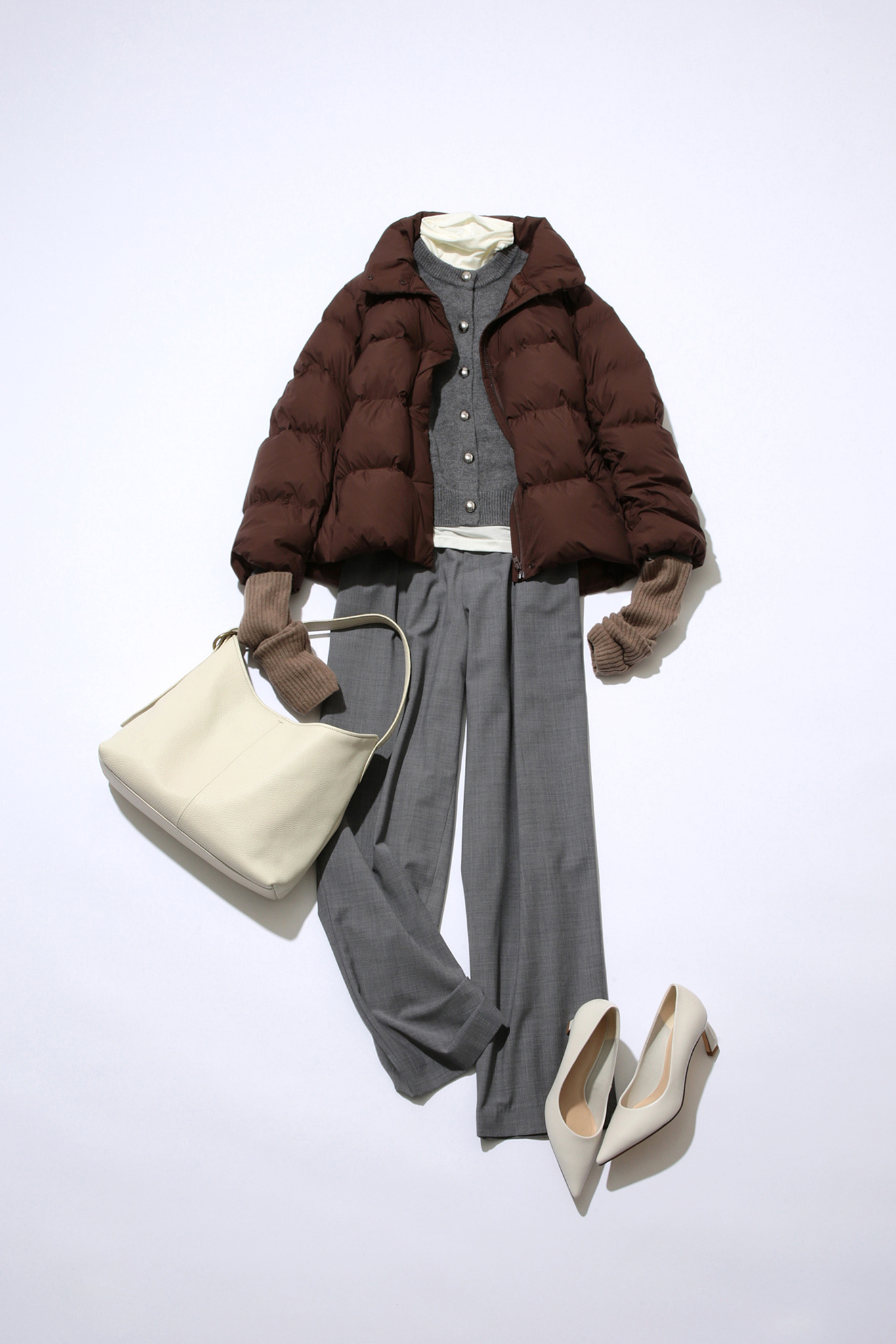 グレーで統一したカーデとボトムスには顔まわりを明るくする白のタートルネックを覗かせて。小物もタートルネックの色と揃えることで、白の面積を増やしコーデに抜け感と軽やかさを生み出します。今季トレンドカラーのブラウンのアウターとアームウォーマーで引き締めると、配色が計算されたオシャレ上級者なレイヤードスタイルが完成。