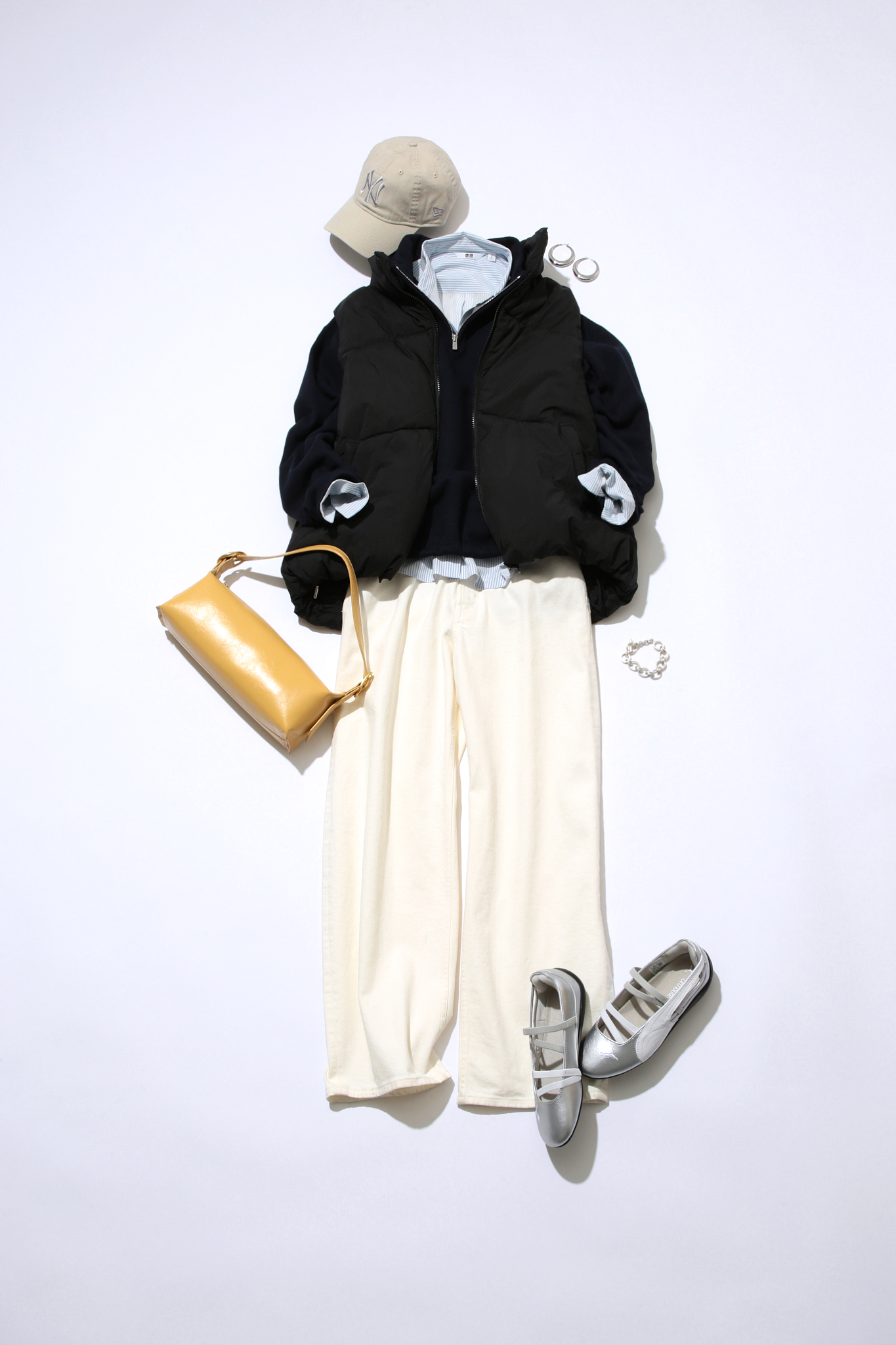 スウェットだけでは少し心もとないこの時期におすすめなのが、シャツをインしたレイヤードスタイル。重厚感のある黒のスウェットも、清涼感のあるブルーシャツを挟むことで一気に軽やかな印象に。着膨れ回避のため、あえてアウターはダウンベストを合わせて。ボトムスは白デニムを合わせると、ブルーシャツと相まってすっきり爽やか映えします!
