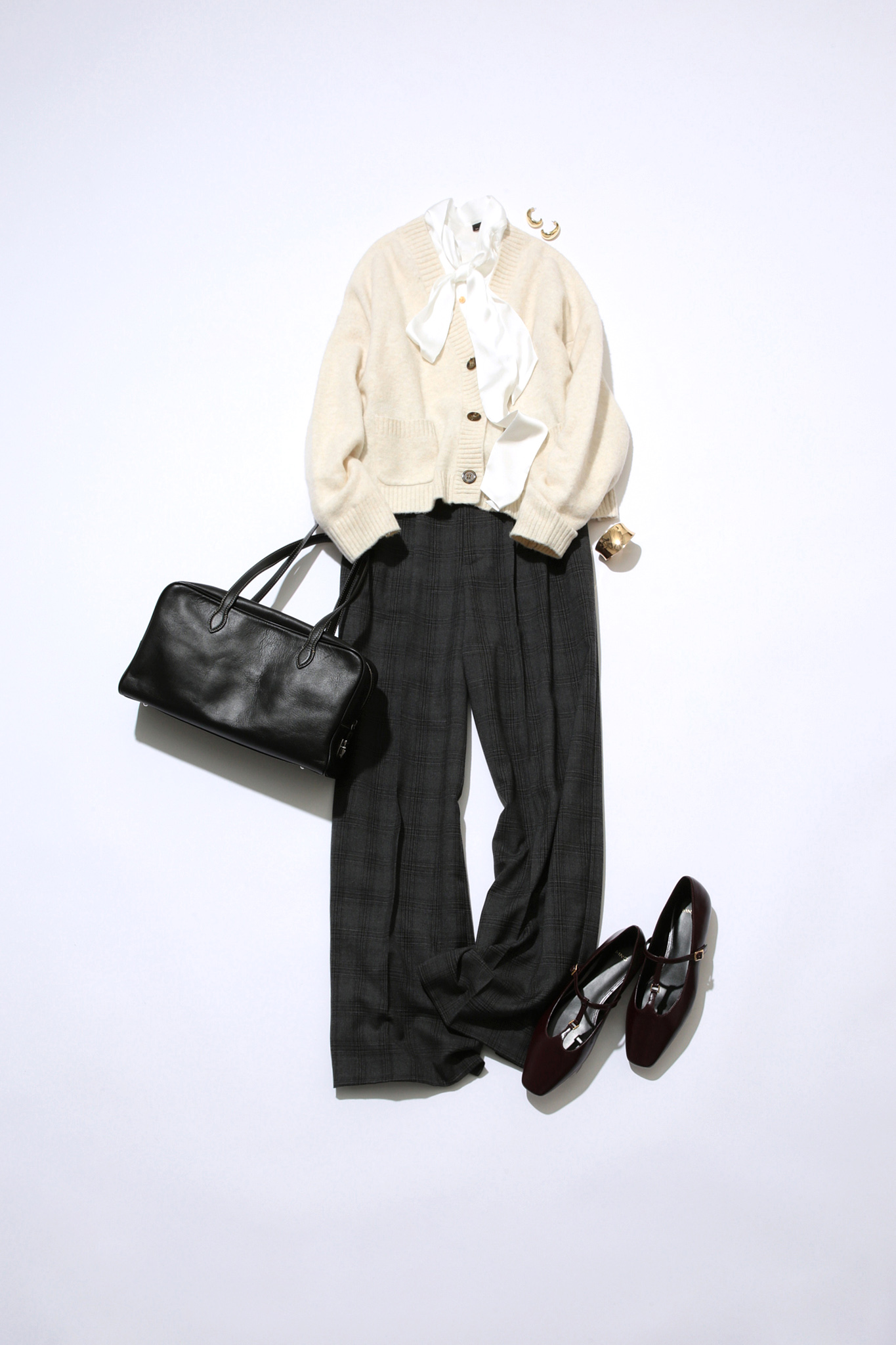 ふわもこなショート丈カーデにボウタイシャツをインすることで、白に奥行きと立体感を持たせて。チェック柄のダークトーンボトムスは知的で上品な印象を与えてくれるだけでなく、上半身の甘さも引き締めてくれます。艶感のあるバッグやシューズで都会的なムードに仕上げて。