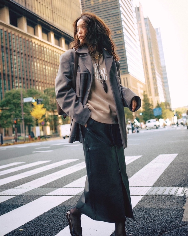 2月18日(水)、カジュアルなロゴスウェットは、レザースカート合わせで一気に都会仕様に。マットな質感が全体をキュッと引き締めてくれるから、ラフなのに手抜きに見えないのが嬉しい。さらに大ぶりアクセを重ねづけして視線を上に集めれば、スウェットをアウトで着ても脚長バランスに。仕上げにグレージャケットを羽織って、スウェットをきれいめに格上げすれば、オフィスカジュアルにもすんなりハマります。