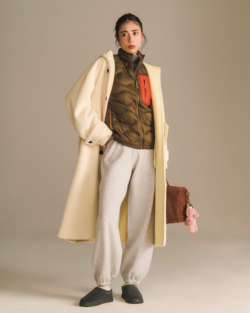 2月21日(土)、グレーのスウェット調パンツを外カジュアルで着たい日は、アウター選びがカギ。軽やかなきれい色コートでスポーティーな中身を包み込めば、一気に大人仕様にシフトします。明るいカラーが冬コーデの重さをやわらげ、抜け感もプラス。バッグや小物をきれいめで統一すれば、インナーにカジュアルなダウンベストを仕込んでも上品さをキープできる、都会派カジュアルに。