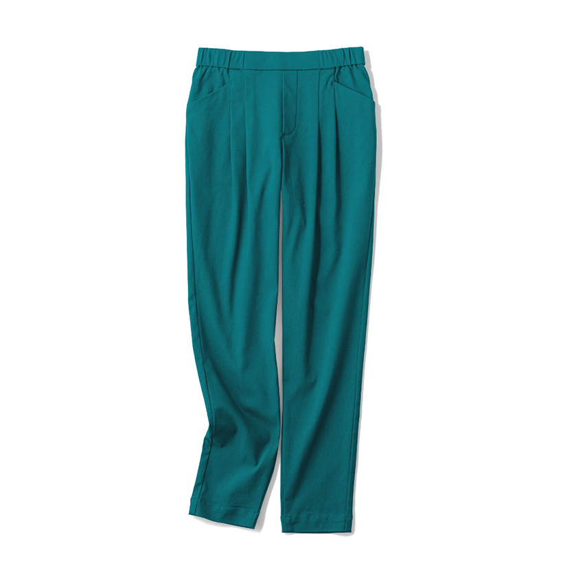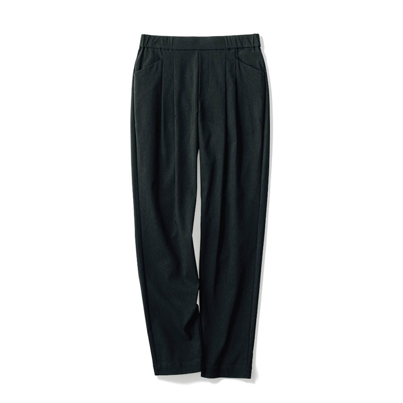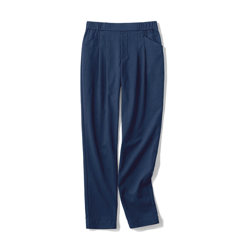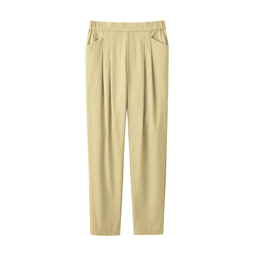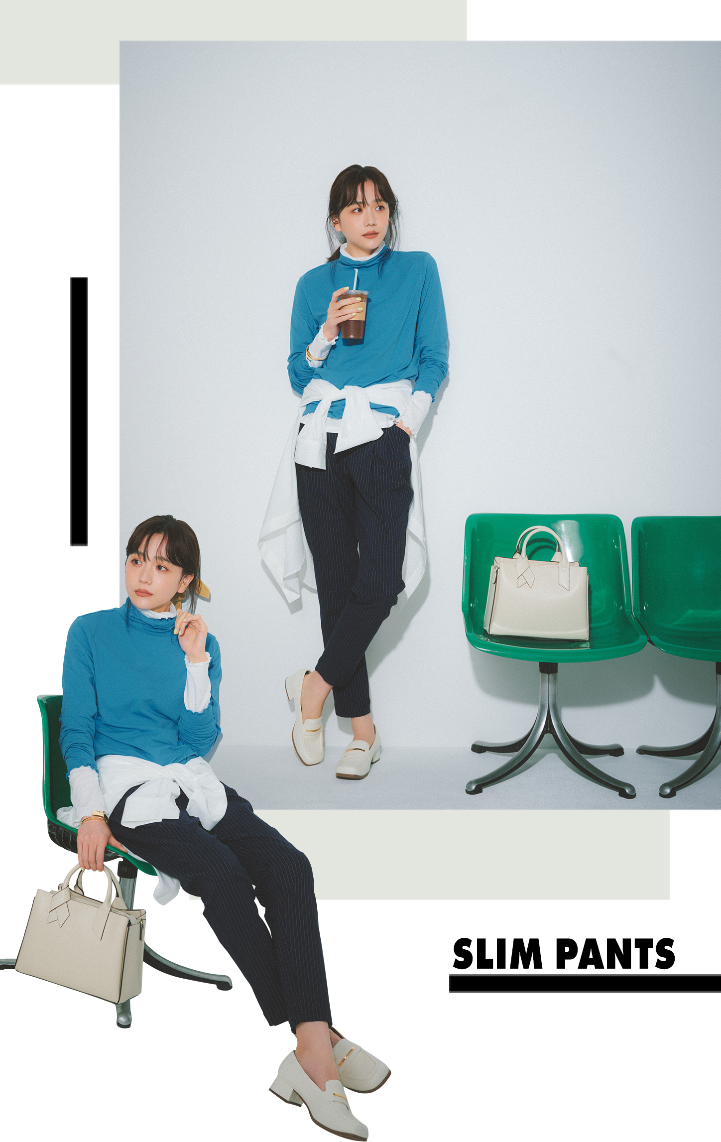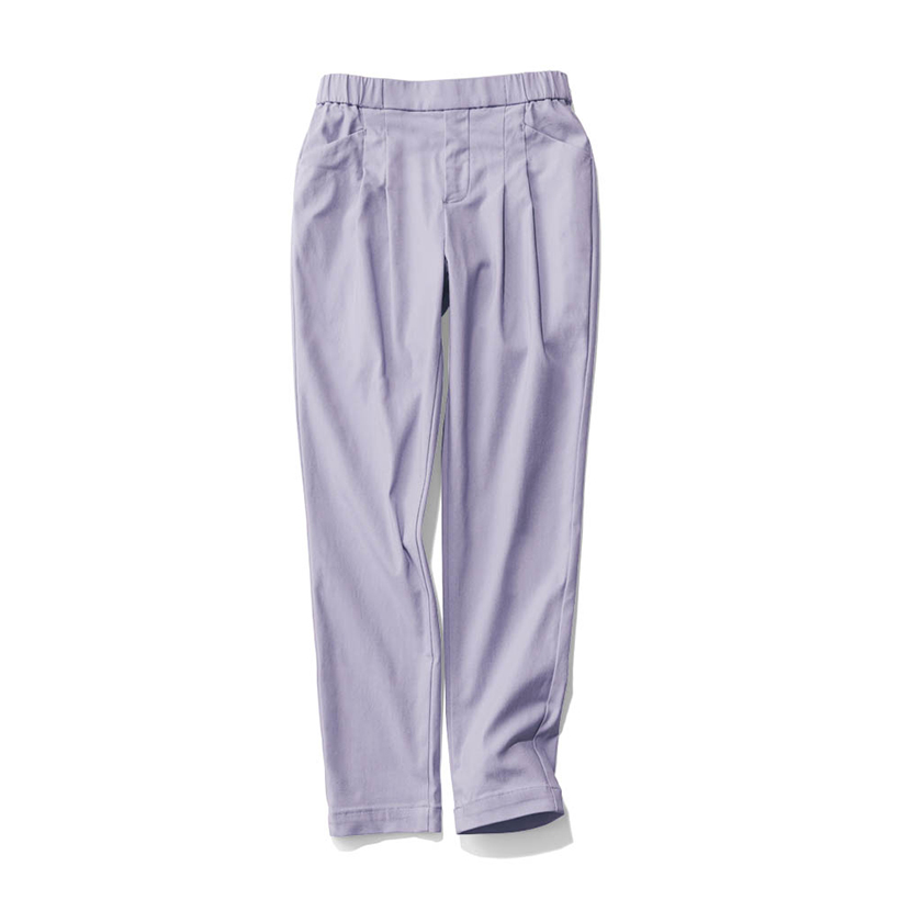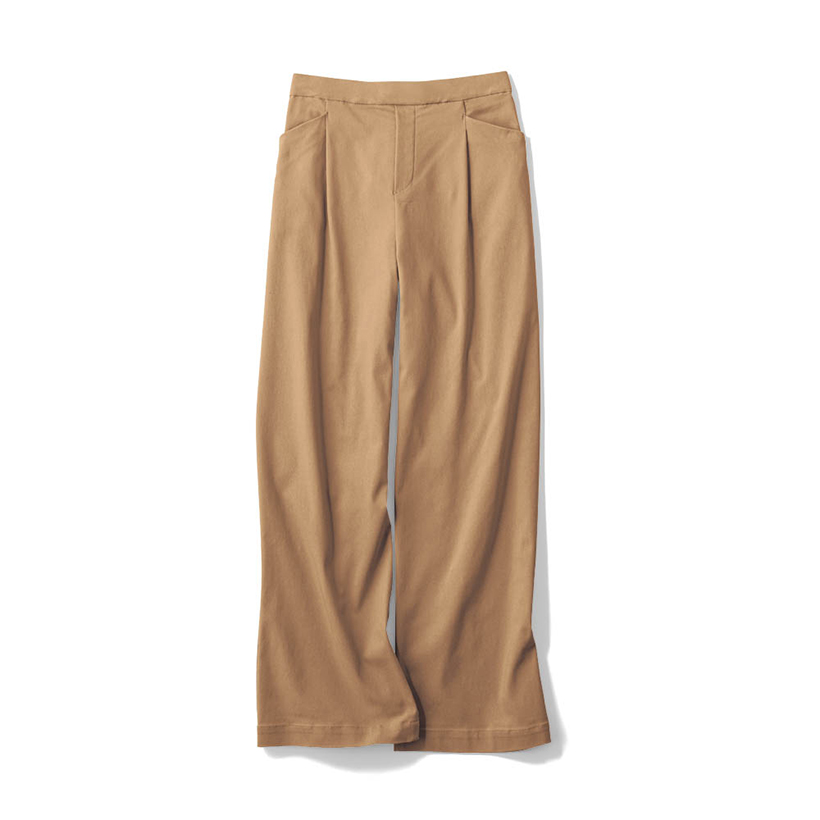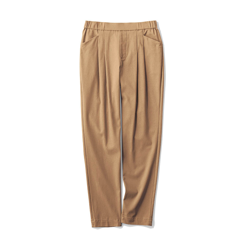 立ち姿はもちろん、座った時のストレスフリーな着用感&シルエットまで計算された一本はS〜6Lと8サイズ、股下は66cm・70cmの2レングスで展開。ウエストは太めのゴム仕様で快適なうえに、ベルトなしでもメリハリのある着こなしが叶います。春らしいベージュパンツには同系色のジャケットとジレを重ねて、今季試したいワントーンコーデが完成。
