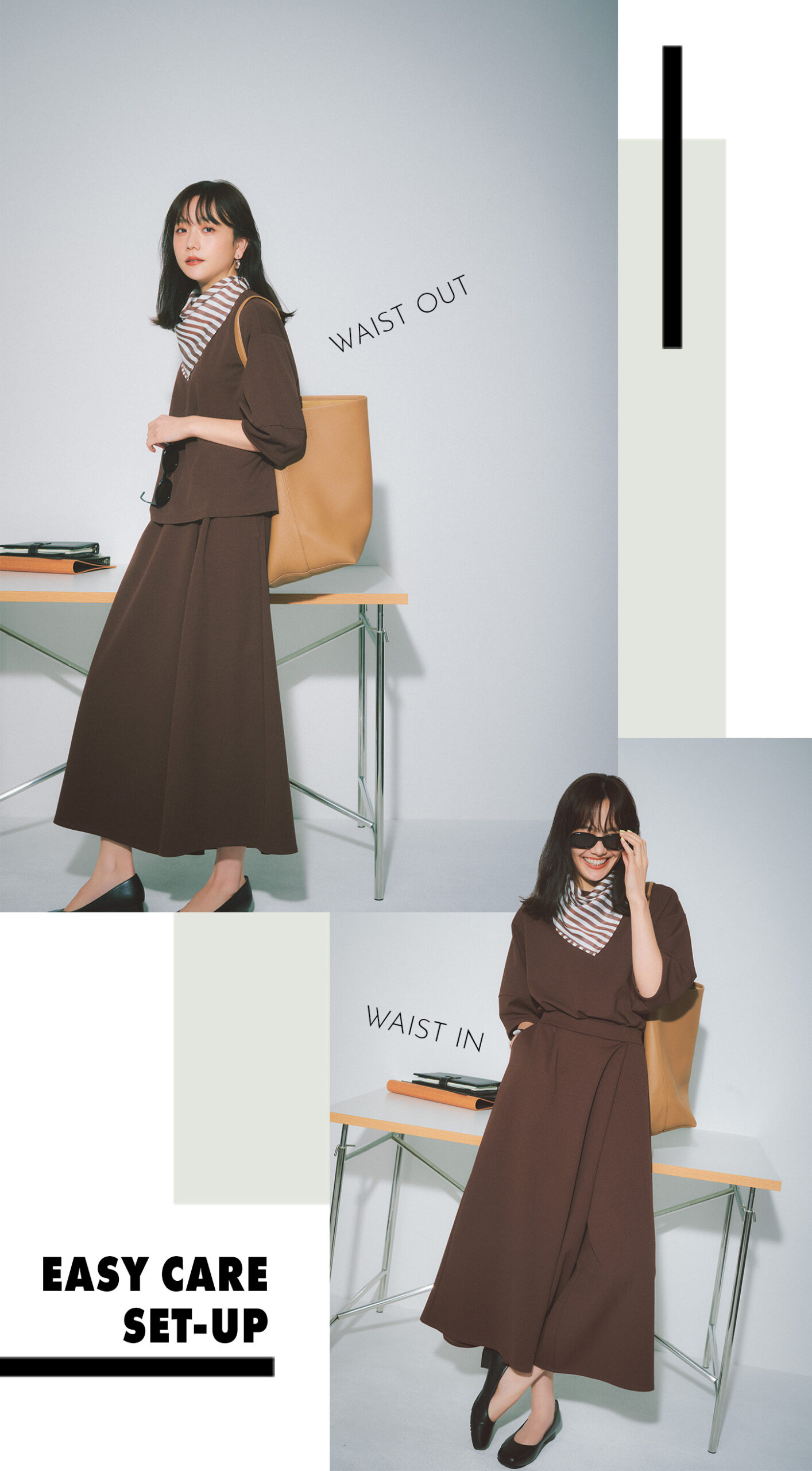 ぽわんと丸みを帯びたランタンスリーブのブラウスと、フレアスカートのように揺れるスカーチョのセットアップは単体でも着回しやすく、コーデの幅もぐんとアップ。ブラウスはやや短めの着丈×ボックスシルエットで、裾をインしてもアウトしてもバランスよく決まるのが魅力。トップス、ボトムスともに洗濯機洗い&乾燥機もOKな「ラクドライ」シリーズで、花粉が気になる季節にも心強い! どちらもS〜6Lと8サイズで展開しています。今季らしく着られるブラウンのほか、ブラック、オフベージュ、ソフトグリーンときれいめシーンにぴったりな4色がラインナップ。