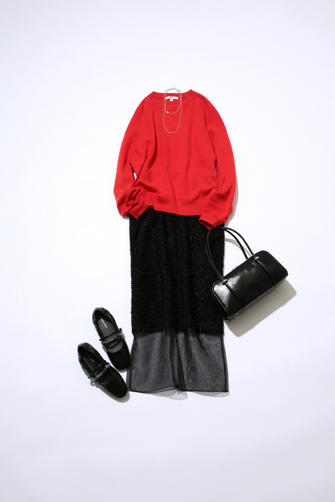 カジュアルなスウェット見えする素材感ながら、顔色をパッと明るく見せてくれる鮮やかな赤ニットは存在感抜群。ラメの入ったシアー感あるスカートは、重くなりがちな黒に軽やかさを与えてくれます。艶感のあるバッグ、スエード素材のシューズがコーデを上品に仕上げ、”頑張りすぎていない華やかさ”を実現。