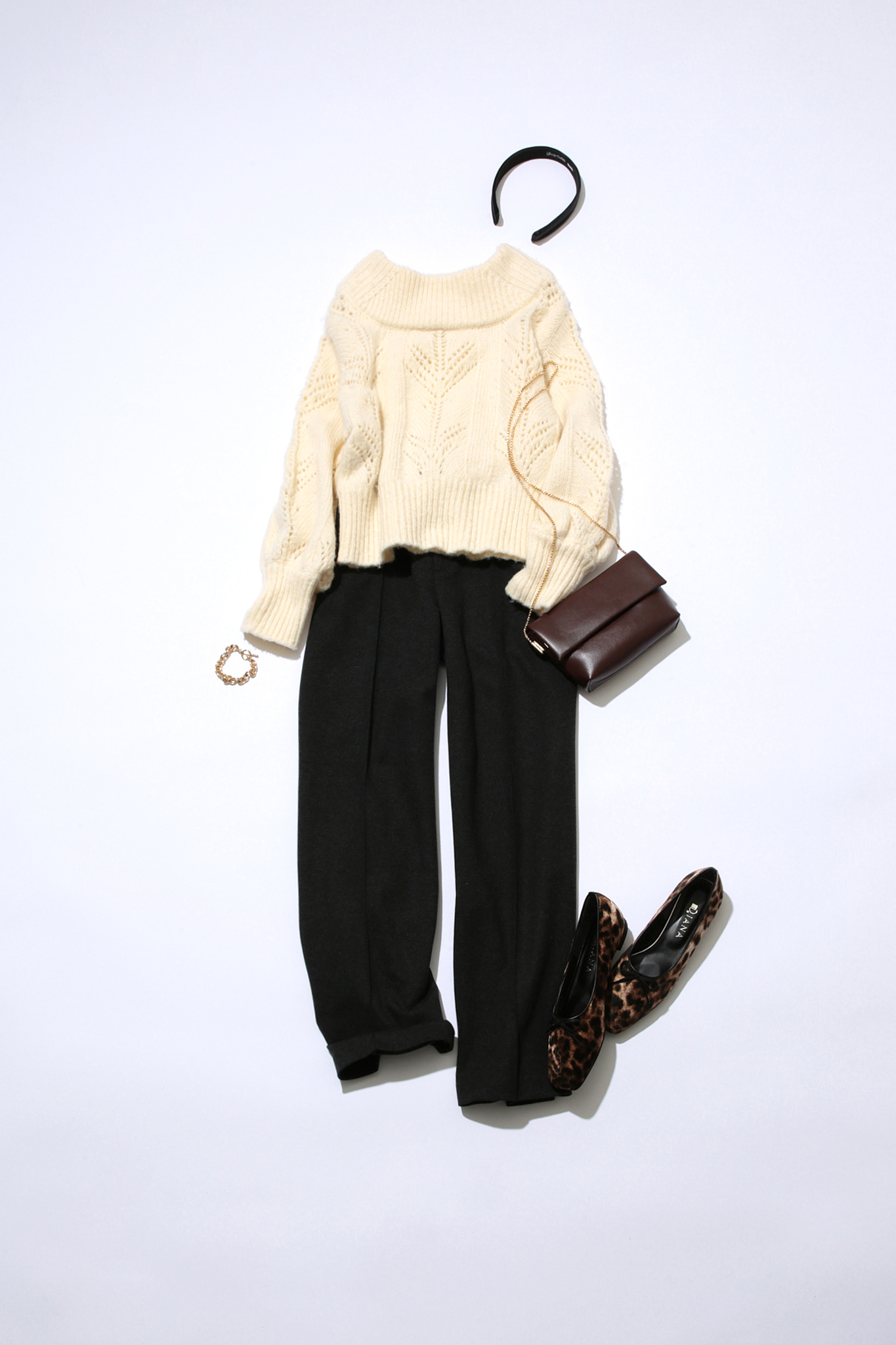 ざっくりとしたゆるふわ白ニットを、暖かみのある起毛感でジャージー素材の黒パンツが引き締めてくれます。シンプルなモノトーンだからこそ、レオパード柄のパンプスやボルドーのバッグなどの小物で品よくまとめると、一気に洒落感UP。暖かい素材でしっかり防寒対策しながらも、オシャレさも忘れない完璧女子会スタイルの完成です。