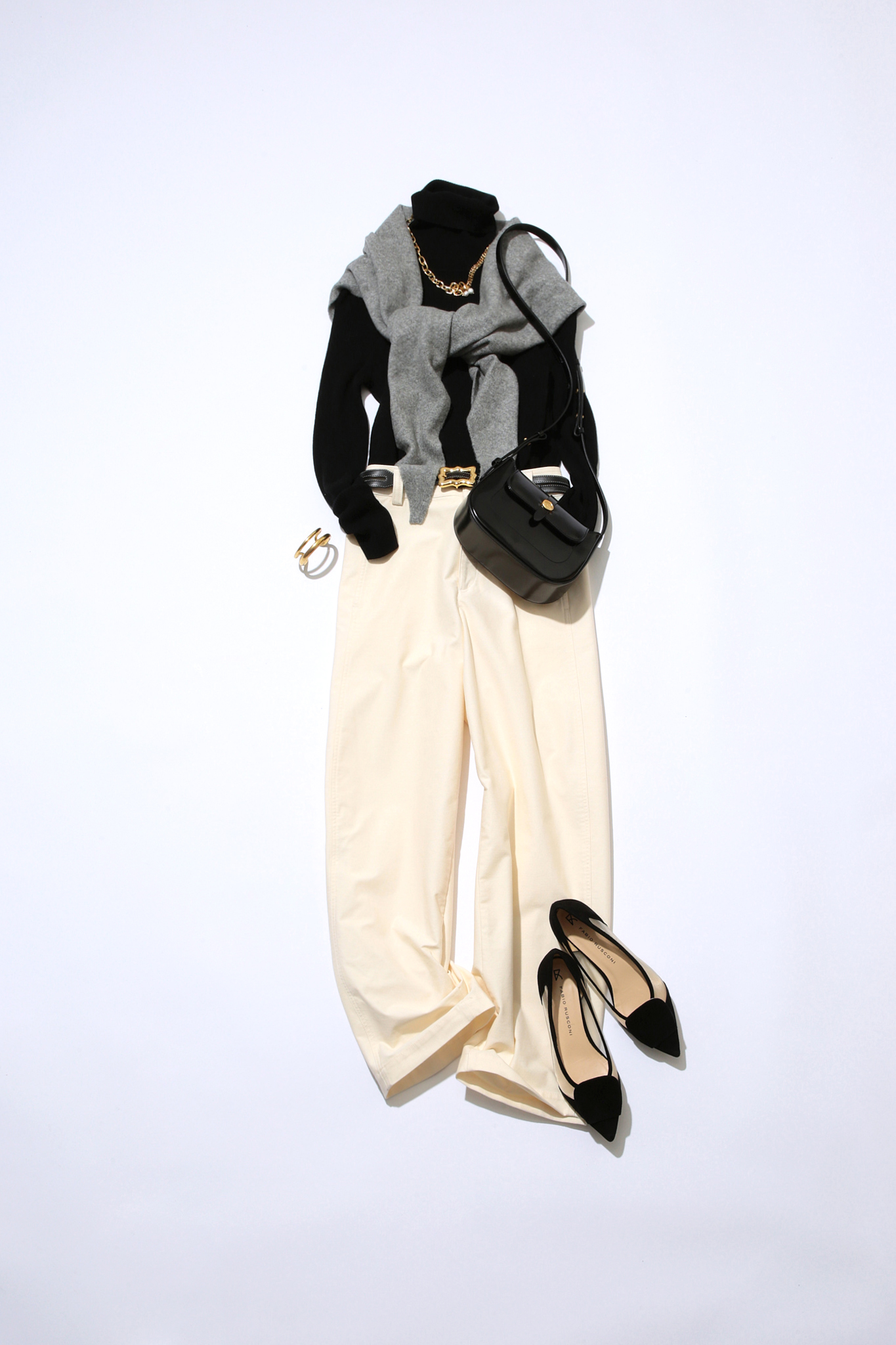 クリーンな輝きを放つ白のバレルレッグパンツは緩やかで絶妙なボリューム感のシルエットが今っぽい!定番黒タートルも、肩掛けしたグレーセーターでこなれ感を演出すれば、重たく見えません。艶感のあるバッグやシューズ、華やかなゴールドがコーデ全体を格上げしてくれて、上品な大人のモノトーンコーデに。