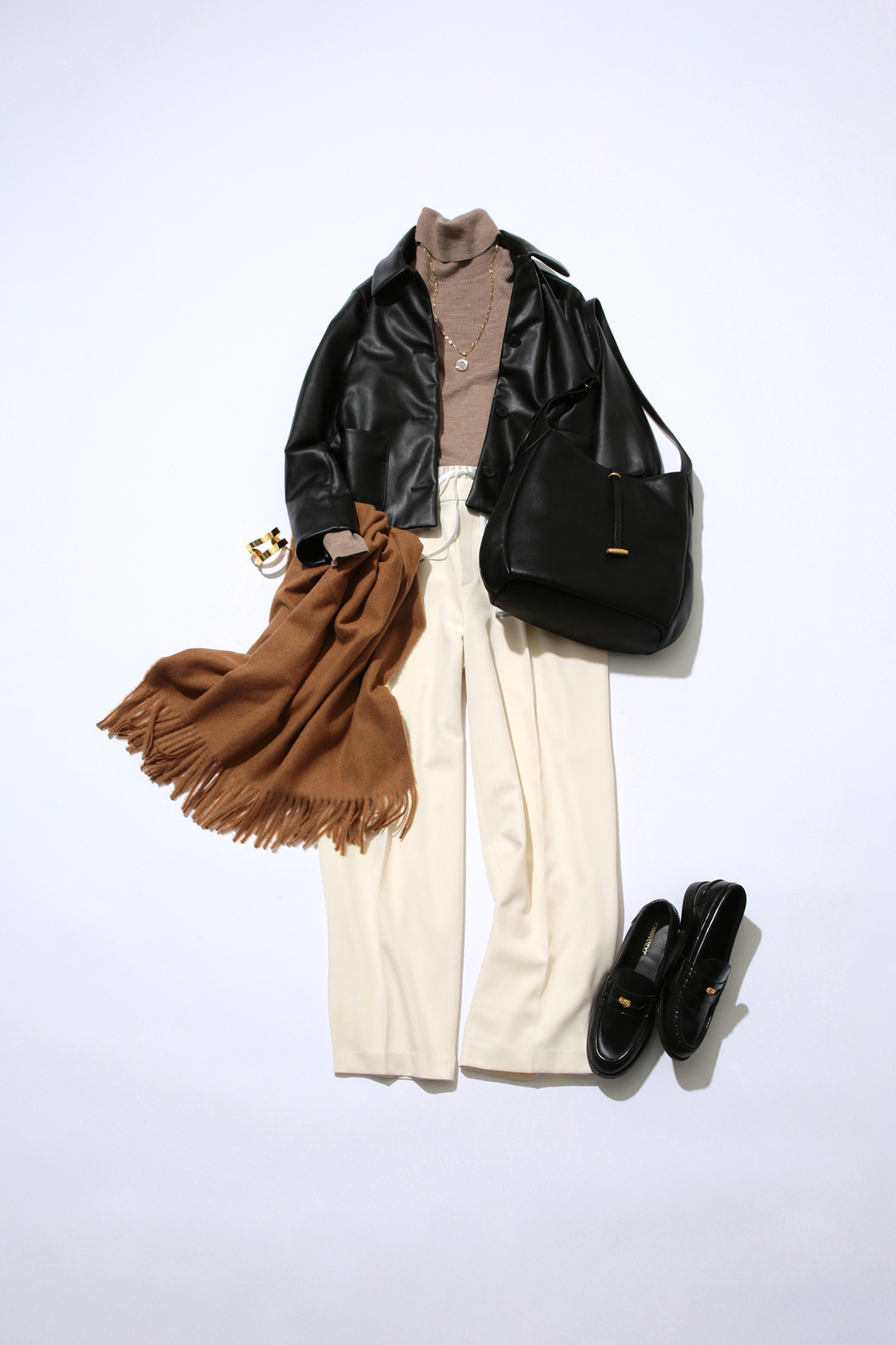 ブラウンのタートルネックと白のワイドパンツはカフェラテのような配色で可愛らしい一方、少し物足りなさも。そんな時は、フェイクレザージャケットを羽織れば辛さでコーデが引き締まり、都会的なモードに一変。バッグやシューズはアウターに、ストールはトップスに色味を合わせると品よくまとまって洒落感UP!