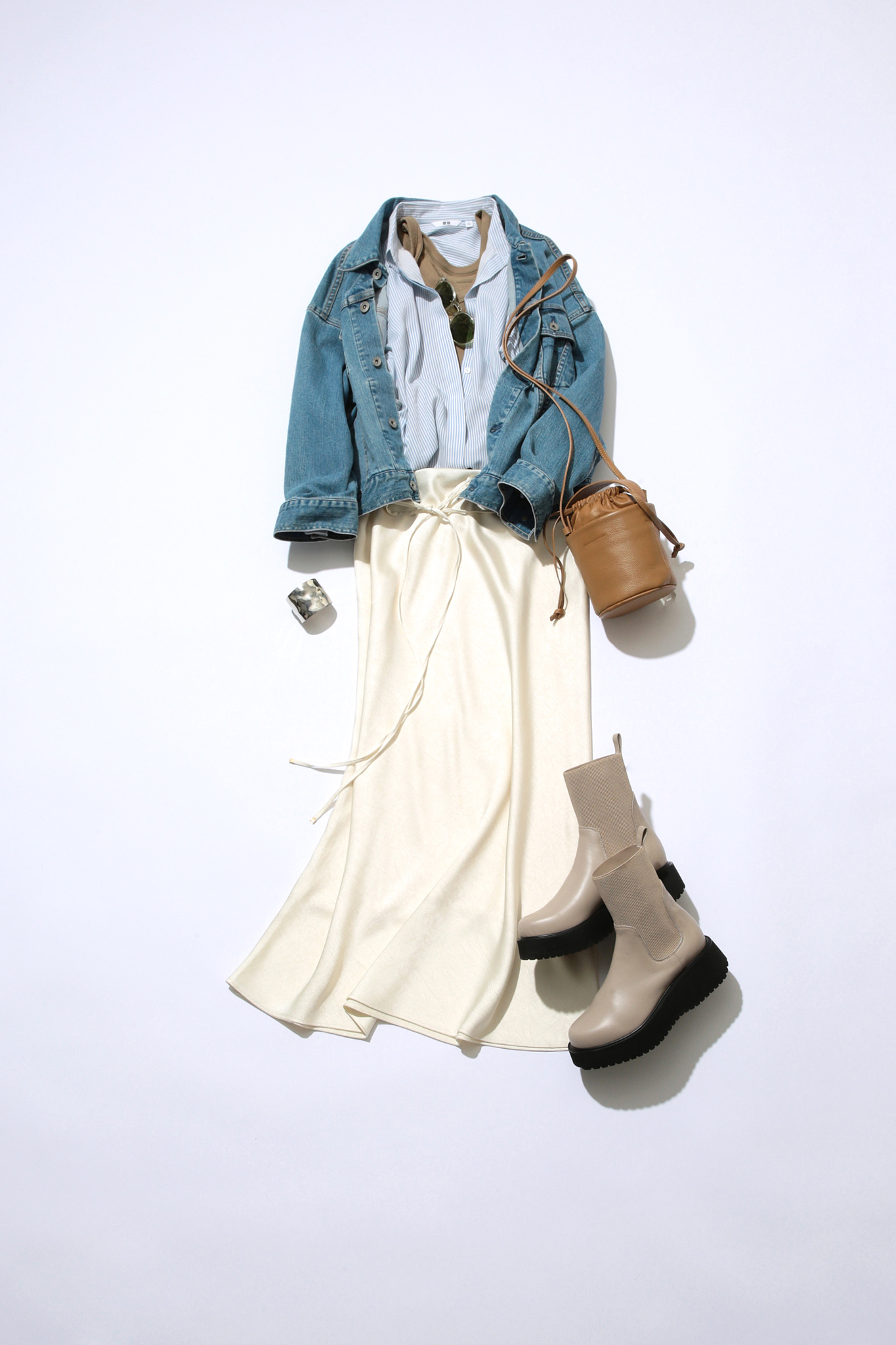 冬のレイヤードでも活躍していたユニクロのストライプシャツは、白ボトムスを春らしく見せる名脇役。しなやかなシャツと艶やかなサテンスカートで女っぽさをつくりつつ、デニムジャケットでほどよくカジュアルダウン。小物はインナーと同じ色味の明るいブラウン系で統一。コーデの色合いにメリハリをつけ、のっぺり見え回避に。