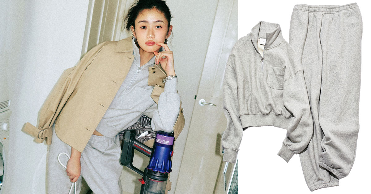アッシュがかった色味なので、立体的でキレイめなスタイリングにもハマります。ハーフジップスウェットトップス¥8,999 スウェットパンツ¥7,999※ともにオンライン限定商品(ともにH&M Studio Essentials/H&M カスタマーサービス)