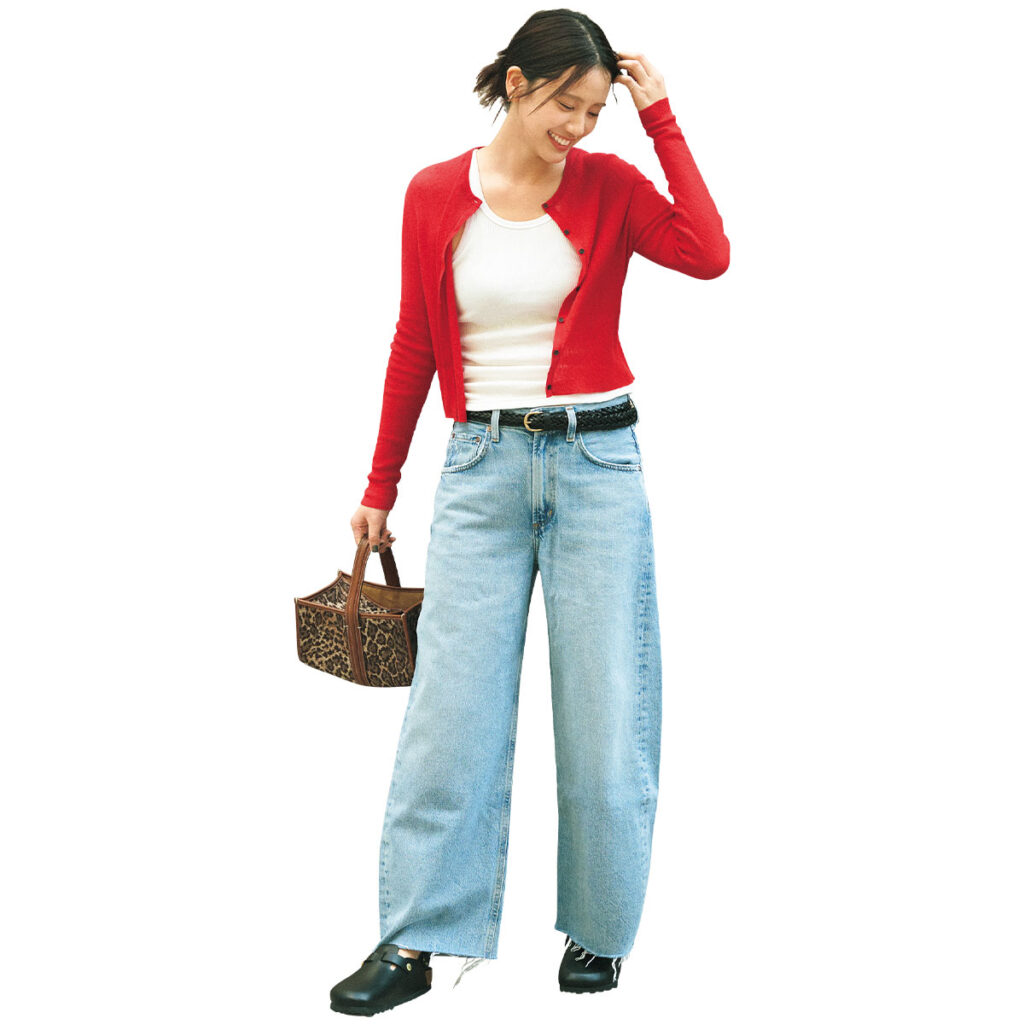 立体的なカーブが魅力のワイドデニムは、はくだけでラインに表情が生まれる頼れる一本。コンパクトな赤カーデを合わせれば、パンツのシルエットが際立ち、好バランスなスタイルに導きます。メッシュベルトやビルケンなどメンズライクな小物を添えて、辛口に引き締めると◎。
