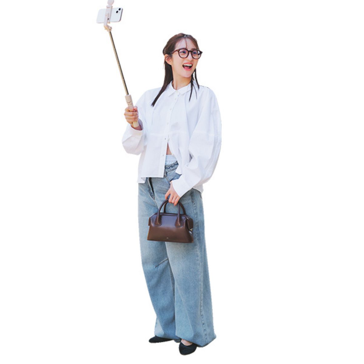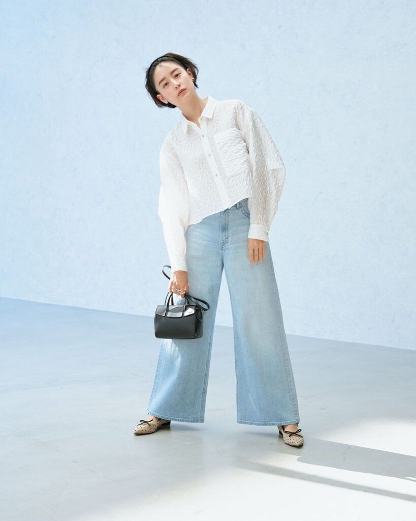 フィット感のある腰回りから裾に向かって広がるワイドフレアは、脚をまっすぐ見せてスタイルアップが狙える人気シルエット。軽やかな薄色デニムに立体感のある白シャツを合わせれば、シンプルなのに表情のある着こなしに仕上がります。足元のバレエシューズで抜けを添えることで、キレイめ派でも挑戦しやすいクリーンなワイドデニムスタイルに。