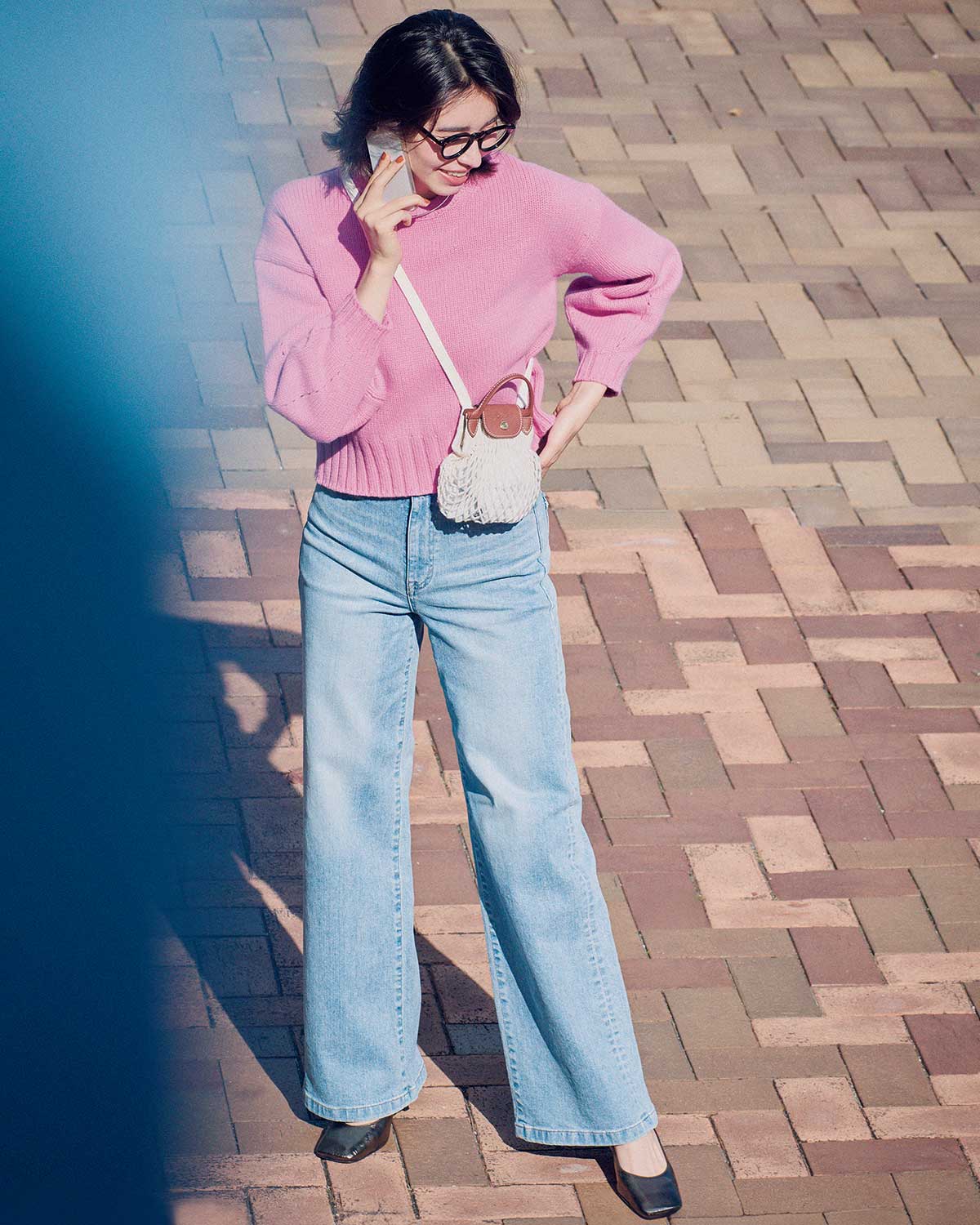 ほんのり甘いピンクニットを、ワイドストレートのすとんとしたラインで大人仕様にシフト。淡色デニムならピンクとの相性がよく、カジュアルでも上品さをキープできます。小ぶりバッグやシャープなパンプスを添えれば、軽やかで凛とした印象に。