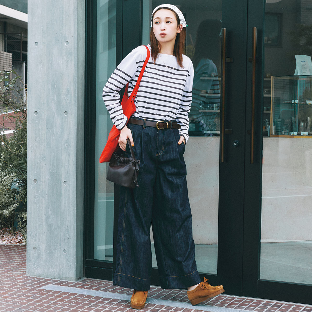 定番のボーダーTが、濃紺のワイドデニムとワラビーの組み合わせで新鮮な表情に。ゆるさのあるシルエットでも、タックのおかげでラフに傾きすぎず大人にちょうどいいまとまりに。赤バッグやヘッドアクセのひと差しで、いつものフレンチが最旬にアップデートされます。