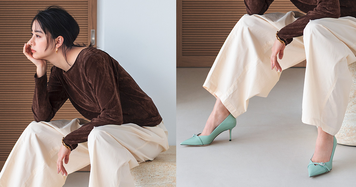 甲にあしらわれたバックルモチーフがアクセントとなった一足は、高すぎない6.5cmの華奢ヒールがエレガントなだけでなくストレスフリーな履き心地。チョコミントのような色合わせで表現する大人なムードを楽しみたい。