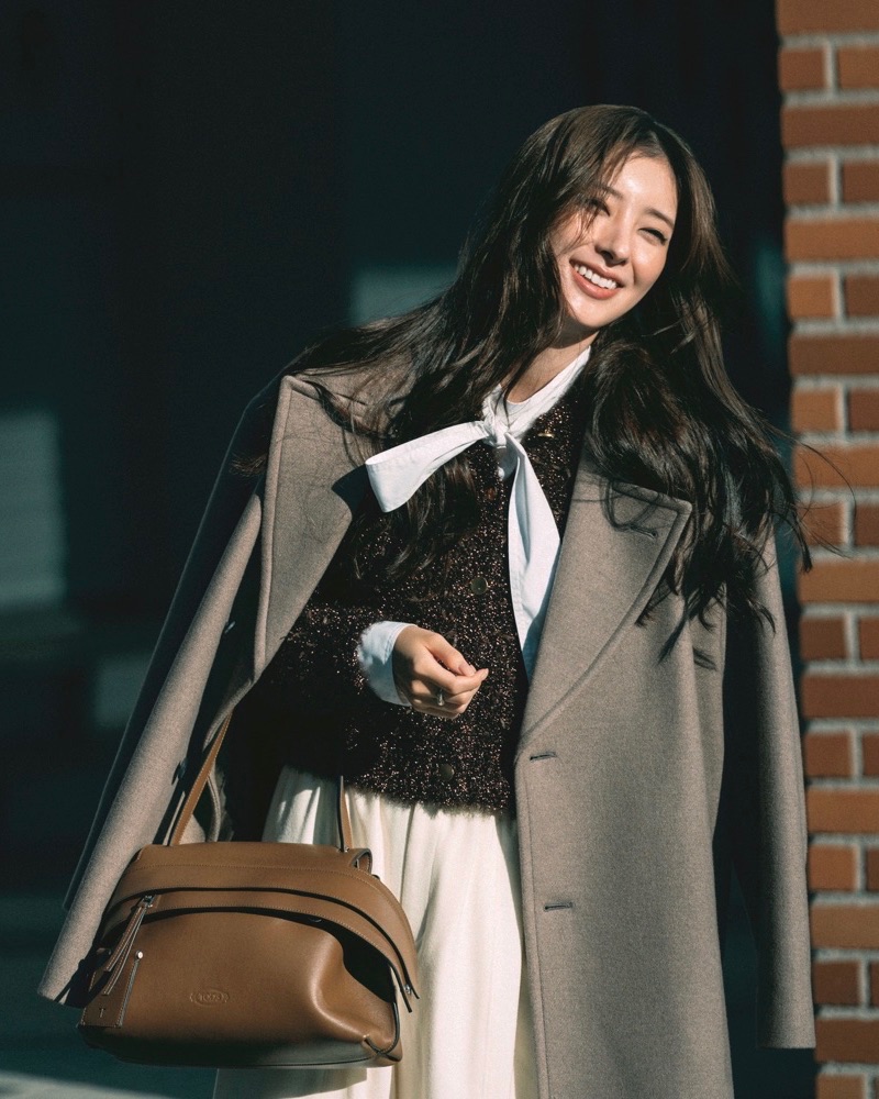 カーディガン¥23,100(カデュネ プレスルーム)コート¥143,000(エイトン/エイトン青山)ボウタイ付きブラウス¥18,920(ハッシュニュアンス/オンワード樫山 お客様相談室)パンツ¥28,930(イウエン マトフ/ユナイテッドアローズ 渋谷スクランブルスクエア店)バッグ¥328,900靴¥146,300(ともにトッズ/トッズ・ジャパン)リング¥14,300(アルティーダウード)