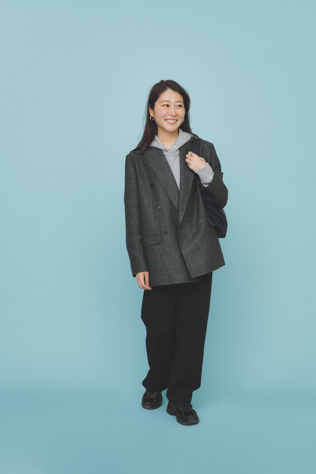 「つい楽ちんな服に頼りがちな旅ですが、大人になるにつれてフォーマルな場所に立ち寄るシーンも増えたので、ジャケットは1枚あると安心。エイトンのジャケットはシルエットが美しく、仕事でもヘビロテしている1着です。パーカーの上からさっと羽織るだけで、ラフな空港スタイルもきちんとした印象に。空港で着替えなくても、そのまま街へ出かけられます」