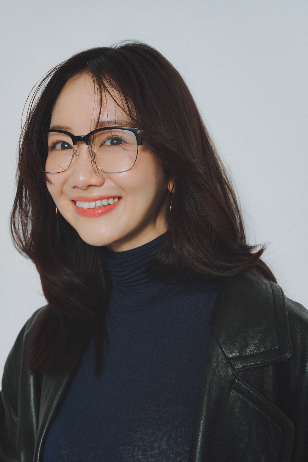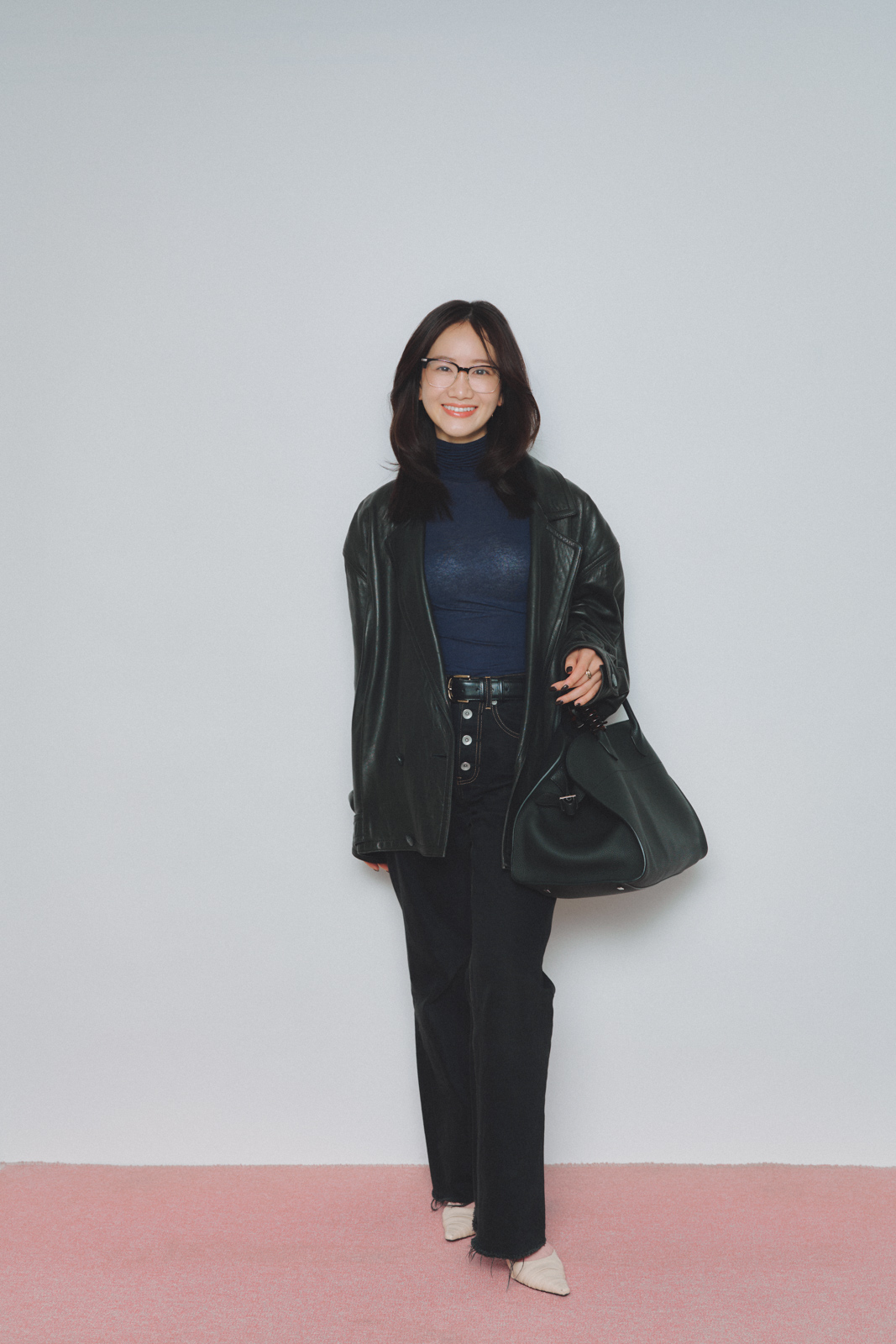 「大好きなブラックコーデは、素材感で軽さを意識。インティミッシミのシアータートルに、エイチ ビューティ&ユースのデニムを合わせてほどよくカジュアルダウンしました。学芸大学の古着屋で見つけたレザージャケットでメンズっぽさを足しつつ、足元はレモンイエローのパンプスで抜け感をプラス。重く見えがちな着こなしも、足元にカラーを効かせるだけでぐっと春らしく仕上がります」