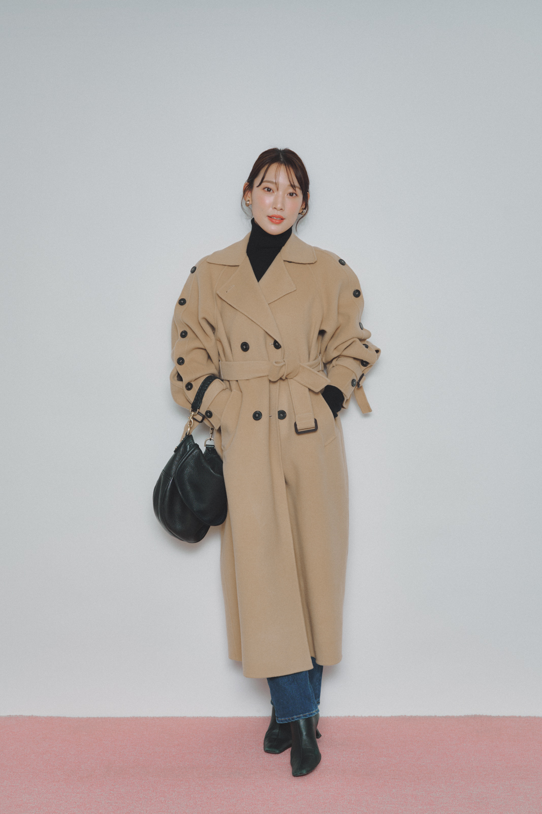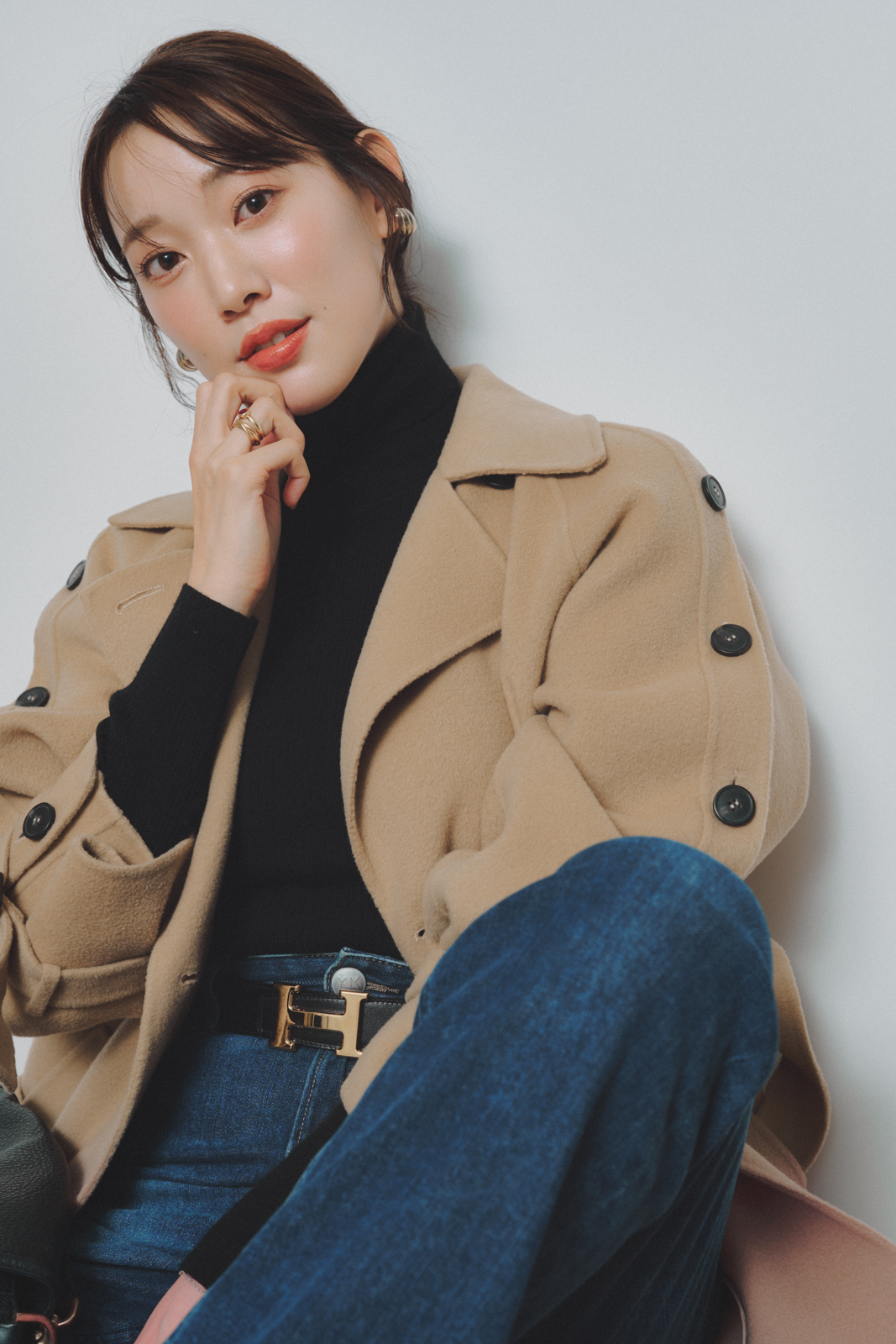 「今季はコンパクトなシルエットが気分で、タートルもデニムもあえて細身で揃えています。王道の組み合わせだからこそ、サイズ感にこだわって今っぽくバランスを調整。マックスマーラのコートはボタンの開け方で肩を見せるアレンジも楽しめるので、まだ夜寒い日にも活躍します」