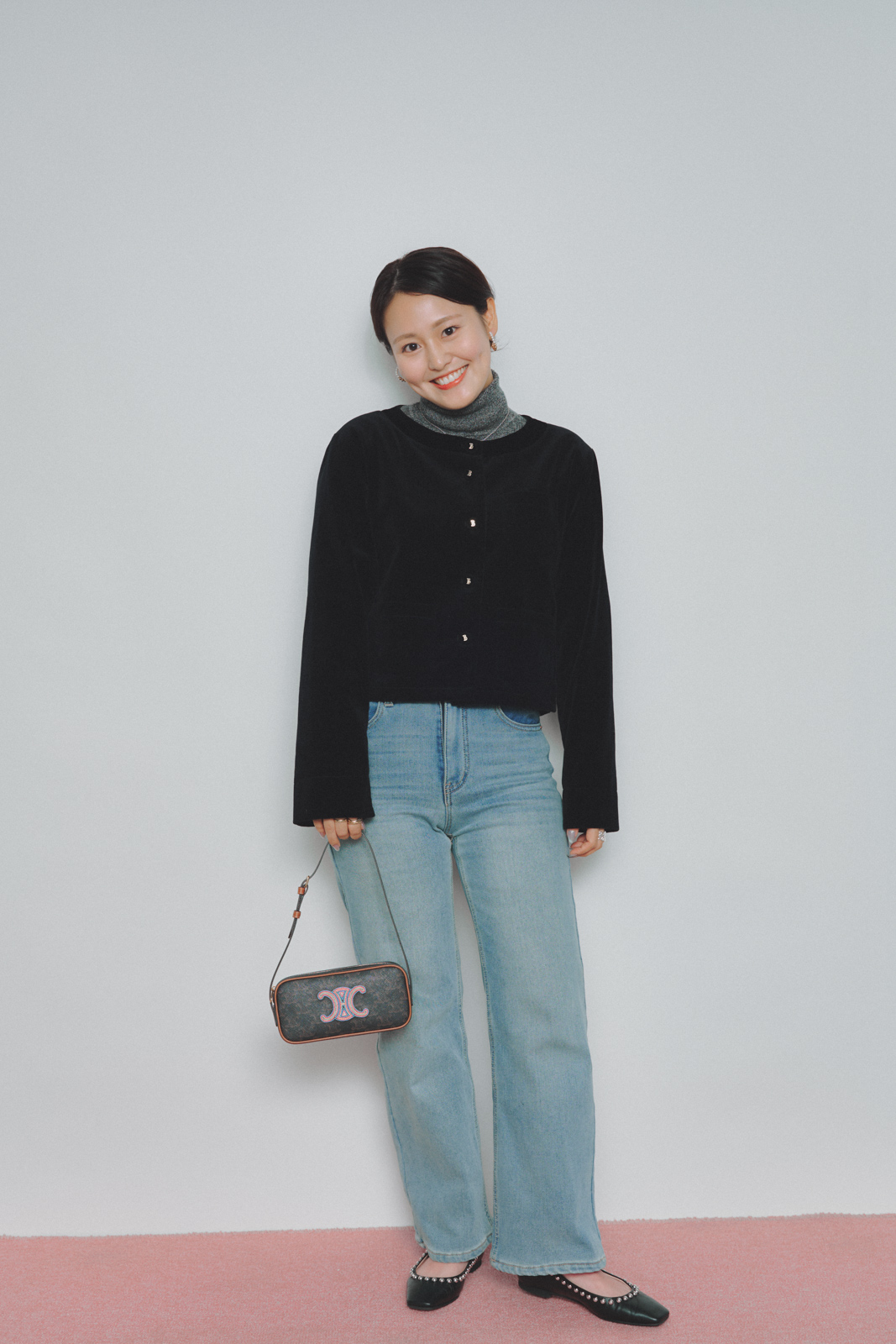 「タートル×デニムの鉄板コーデは、ブルーデニムで今っぽく更新。コカのデニムはシルエットのきれいさが魅力で、ほどよいハイウエストと、足のラインを拾いにくいストレートがお気に入り。手に取りやすい価格も魅力のひとつ。カジュアルな分、セリーヌのバッグやジミー チュウのシューズなど小物で引き締めました」