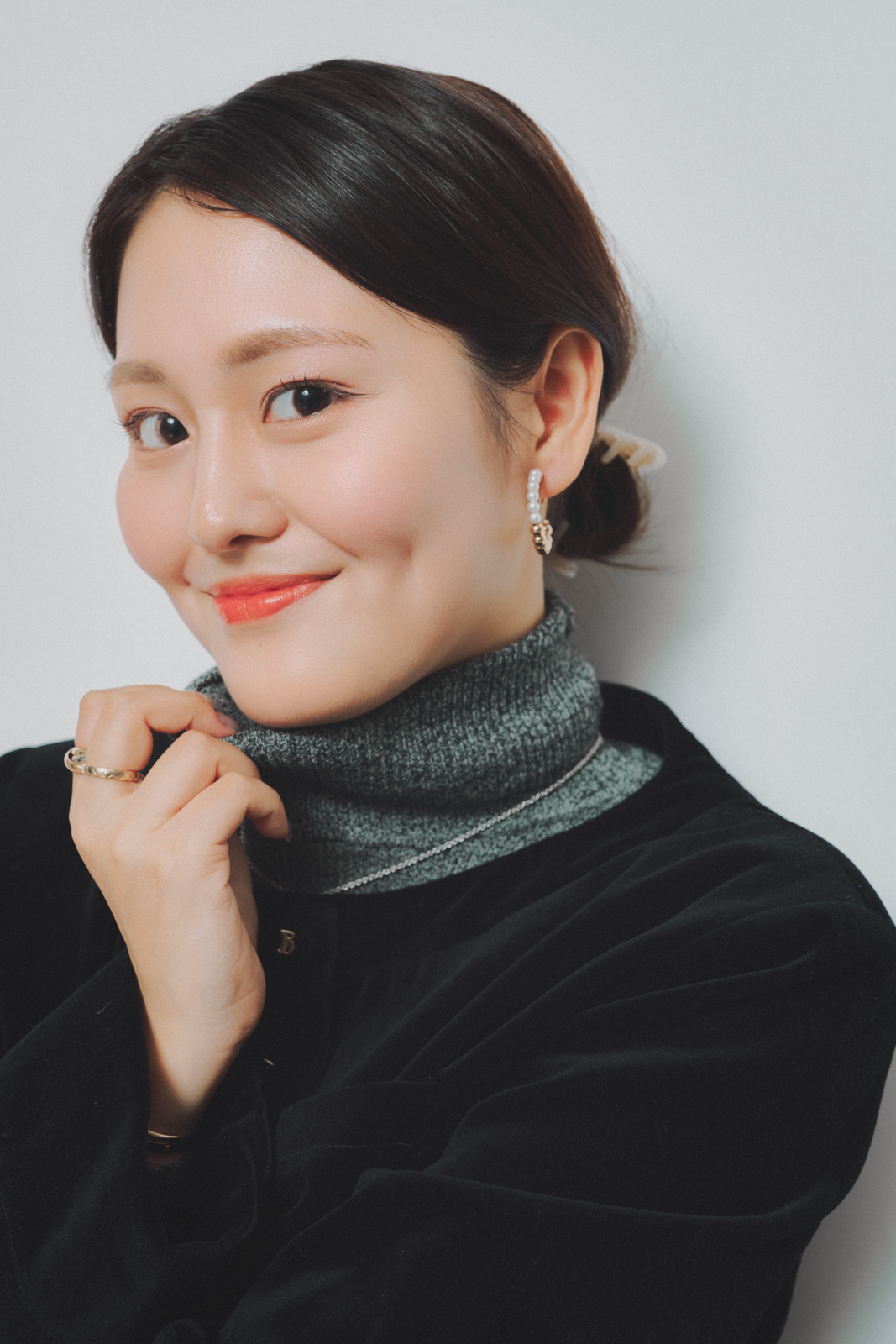 「ユニクロのタートルは、薄手でフィット感がありレイヤードにも使いやすい一枚。グレーと白のミックスカラーで、ジャケットのインナーに合わせても重くならず、奥行きが出ます。羽織るだけでサマになるザ バーネットのジャケットは、ベルベット素材で上品な印象になります」