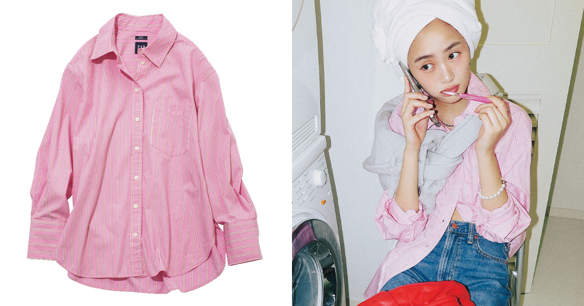大きめサイズのシャツならGAPらしいポップな色を。胸に刺繡があしらわれていたり、カフスが太かったりと通勤スタイルに寄り添う、トラッドな要素をしっかりと完備しているのも魅力。ストライプシャツ¥9,990(Gap)