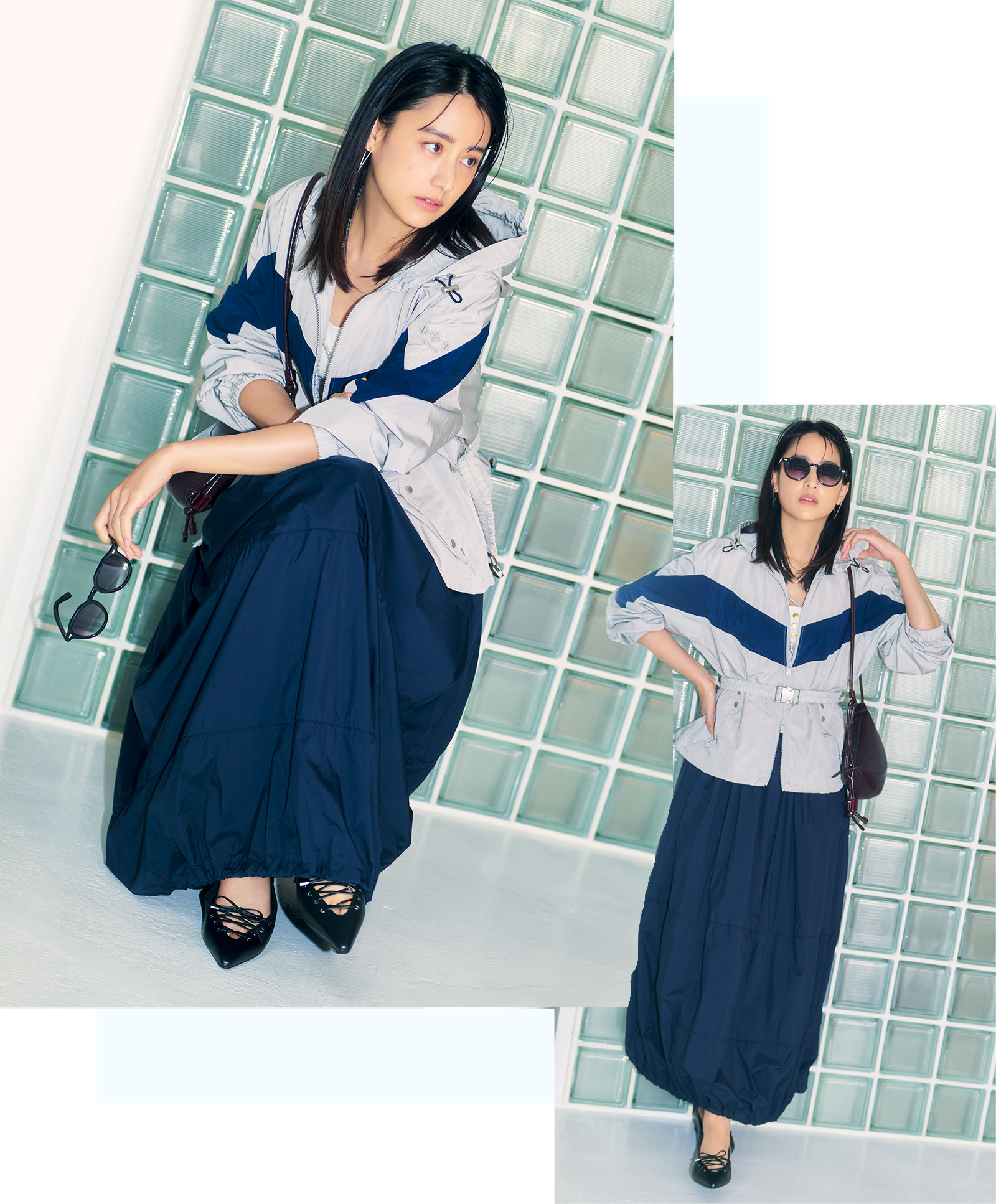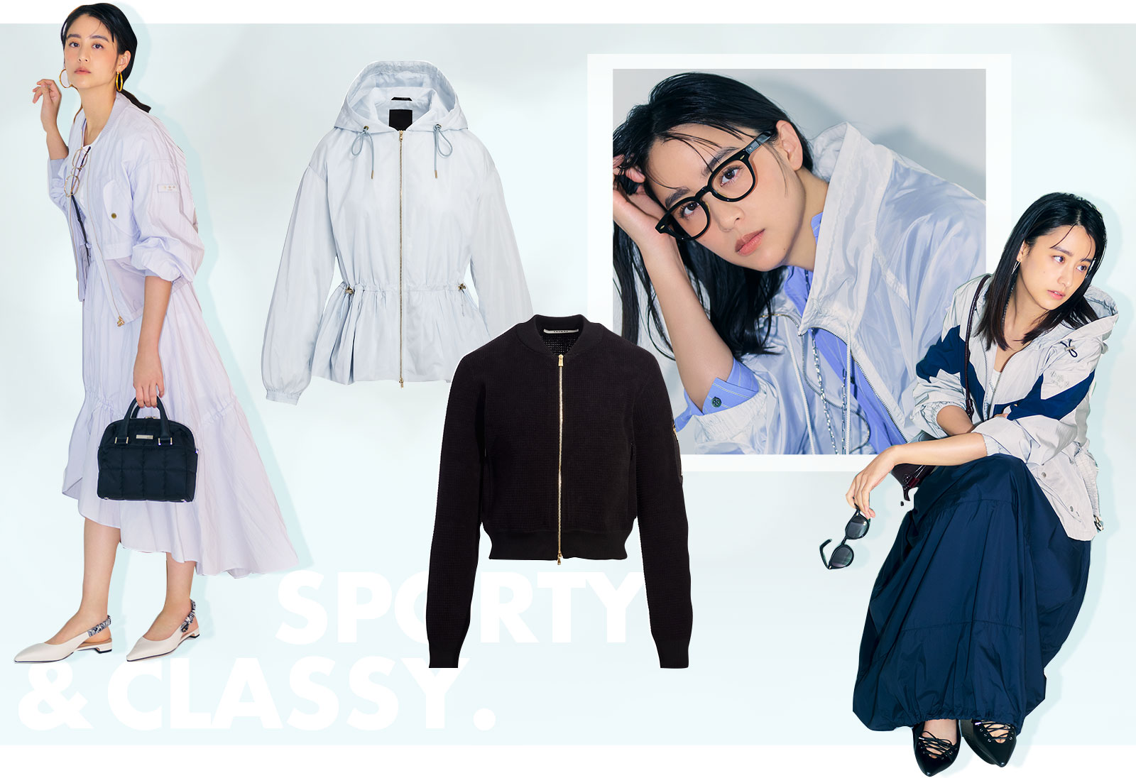 今季注目のコンパクトなMA-1は、春らしいやわらかなニュアンスのライトグレーを選べばぐっと都会的な印象に。同素材のマーメイドスカートとのセットアップで、トレンドのスポーティを女っぽいムードで楽しめます。ブルゾン¥101,200Tシャツ¥24,200スカート¥58,300バッグ¥71,500(すべてタトラス/タトラス カスタマーセンター)フラットシューズ¥13,900(CHARLES & KEITH/CHARLES & KEITH JAPAN)メガネ¥52,800(モスコット/モスコット アオヤマ)ピアス¥17,600(アビステ)