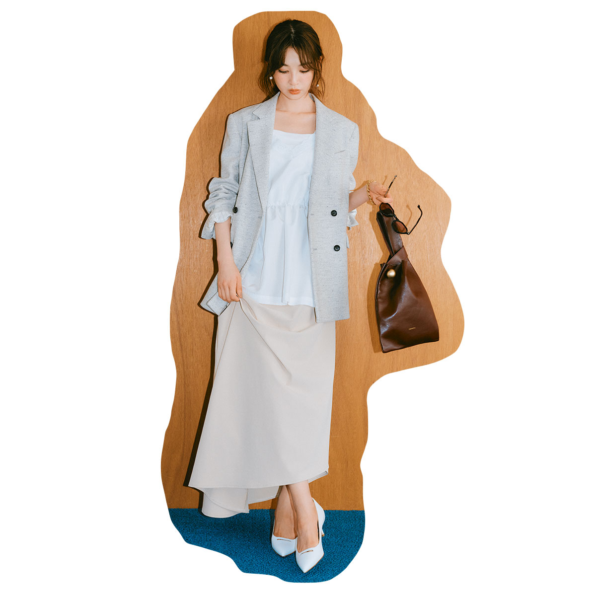 淡いトーンでまとめたロングスカートに、ツイードジャケットを重ねて上品な奥行きをプラス。揺れ感のあるスカートも、ツイードのきちんとさが加わることで甘さがほどよく抑えられます。白パンプスとブラウン小物を合わせれば、通勤にもぴったりなキレイめオフィカジとして活躍。