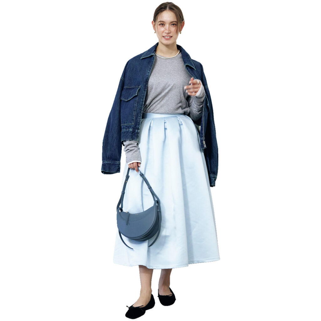 サックスブルーのフレアスカートは、光を受けて揺れる素材が春らしく、淡色でも端正に見える一枚。グレーTを合わせるとほどよく力が抜けて日常にもすっとなじみます。仕上げにデニムジャケットを重ねれば親しみやすさが加わり、“はじめまして”の多い春に好印象な装いに。