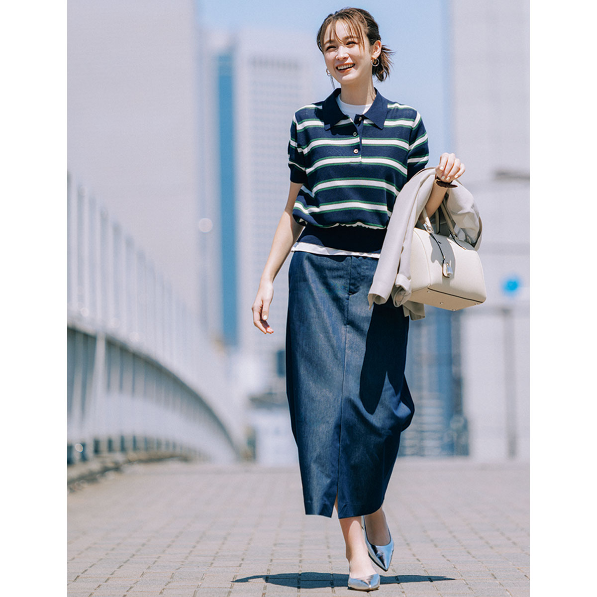 通勤にも使えるキレイめデニムスカートは、ハイウエストの細身シルエットで着こなせば腰回りがすっきり。濃色デニムならカジュアルすぎず、きちんと派にもなじみやすい印象に。トレンドのポロシャツを合わせればほどよく親しみが生まれ、オフィスで“話しかけやすい雰囲気”を纏う爽やかスタイルに決まります。