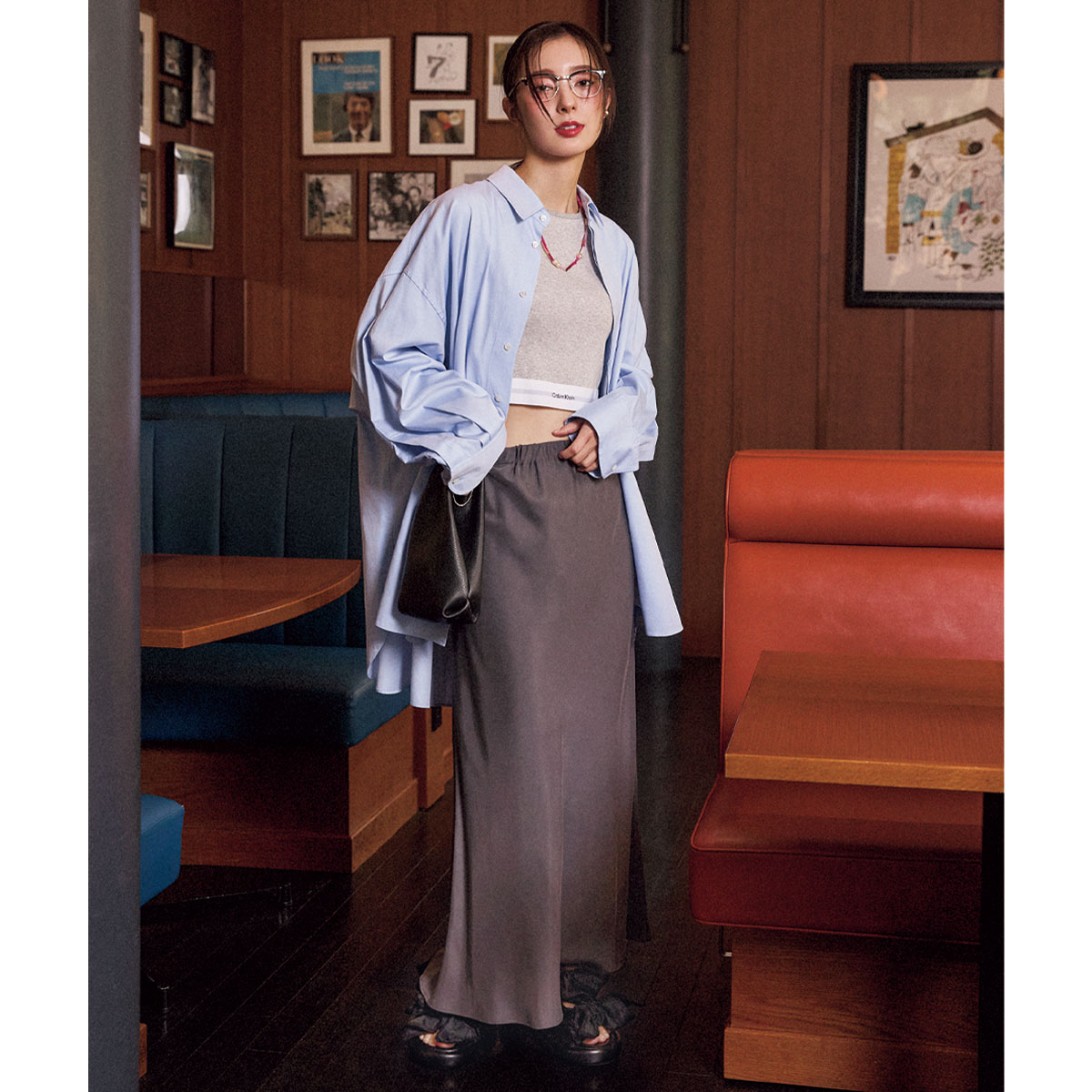 落ち着いたグレーのロングスカートに、クロップドタンクとビッグシャツを重ねたヘルシーなレイヤード。直線的なスカートが肌見せのカジュアルさを受け止めてくれるから、大人でも挑戦しやすいバランスに仕上がります。アイコニックなメガネやリボンシューズで、コーデの洒落感をグッと底上げ。