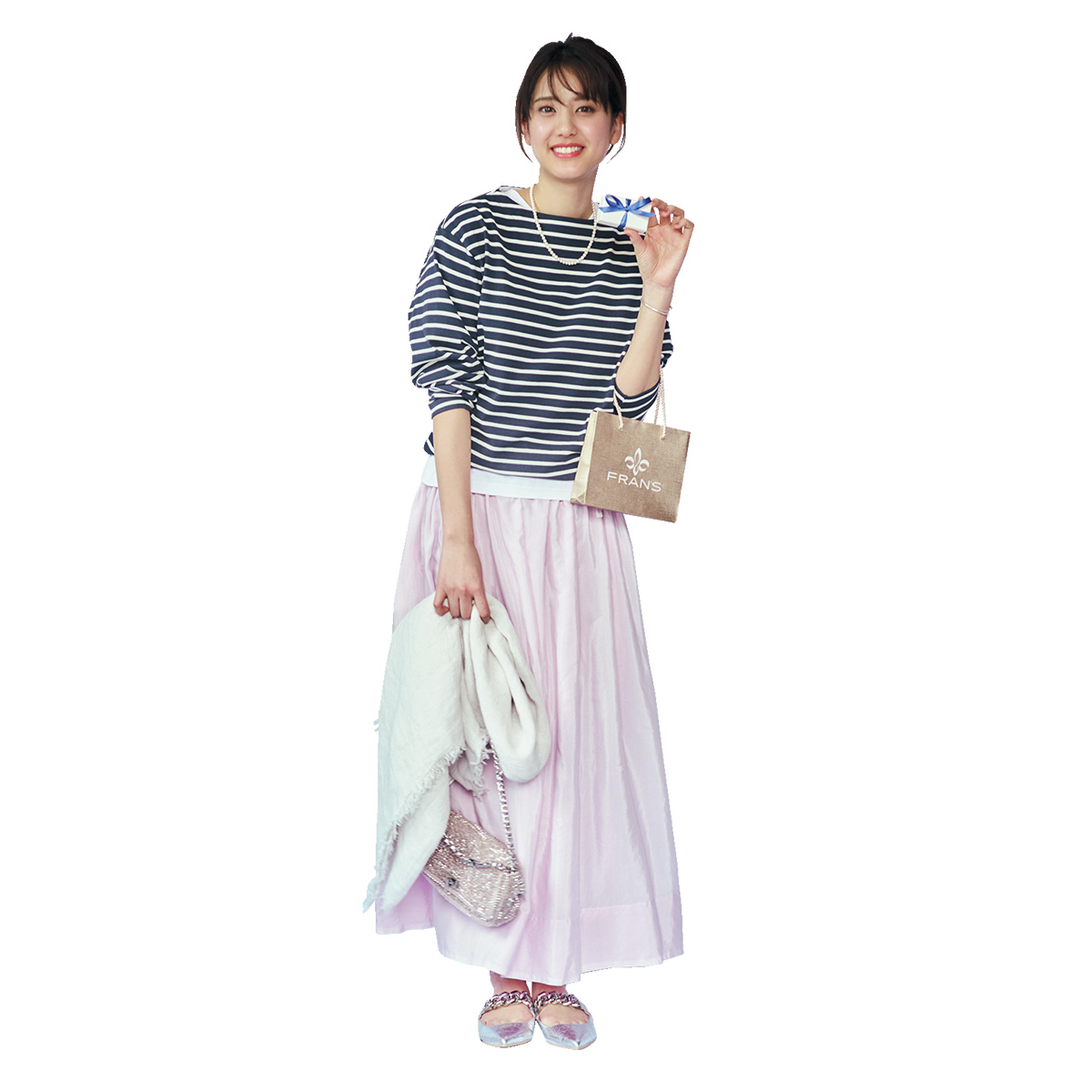 淡いピンクのロングスカートは、シアーな揺れ感が春らしく、広がりすぎないシルエットで大人にも取り入れやすい一枚。甘い色合いも、ボーダートップスのカジュアルさを重ねればこなれた印象に傾きます。フラットシューズや淡色小物で軽やかさを添えれば、気負わず楽しめる春のお出かけスタイルが完成。