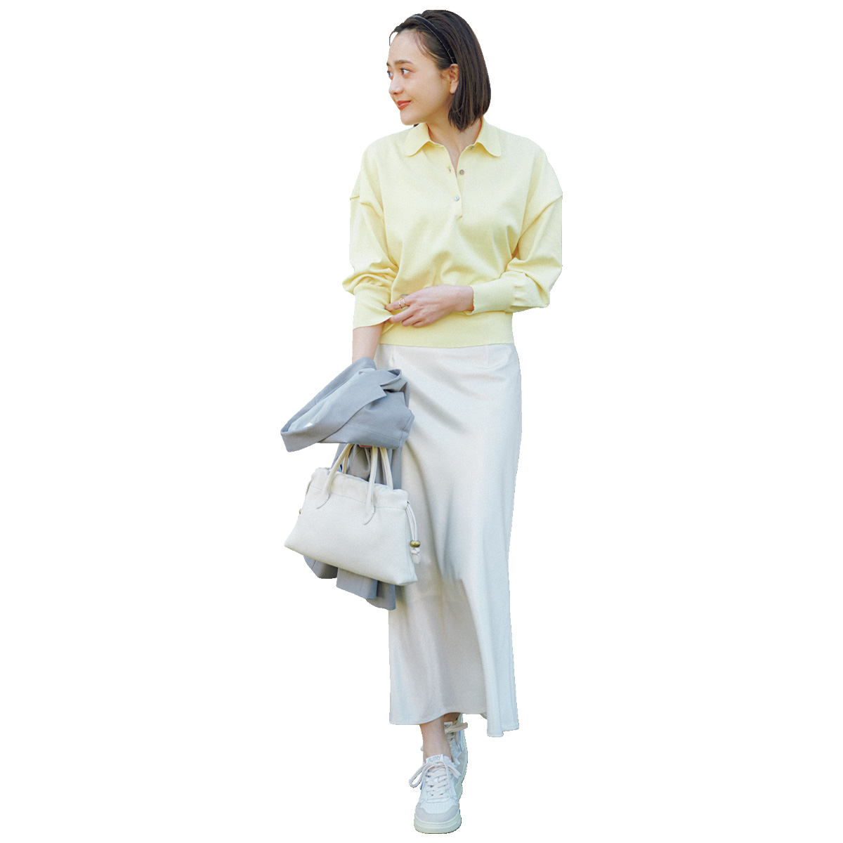 まっすぐ落ちるラインとロング丈で、クリーンなムードたっぷりな白スカート。歩くたびに揺れるしなやかな生地が、シンプルながら上品さを添えてくれます。バターイエローのポロニットは、衿付きの少しメンズライクなシルエットで甘さをセーブ。白スニーカーを選び、キメすぎないスタイルに寄せるのがカギ。