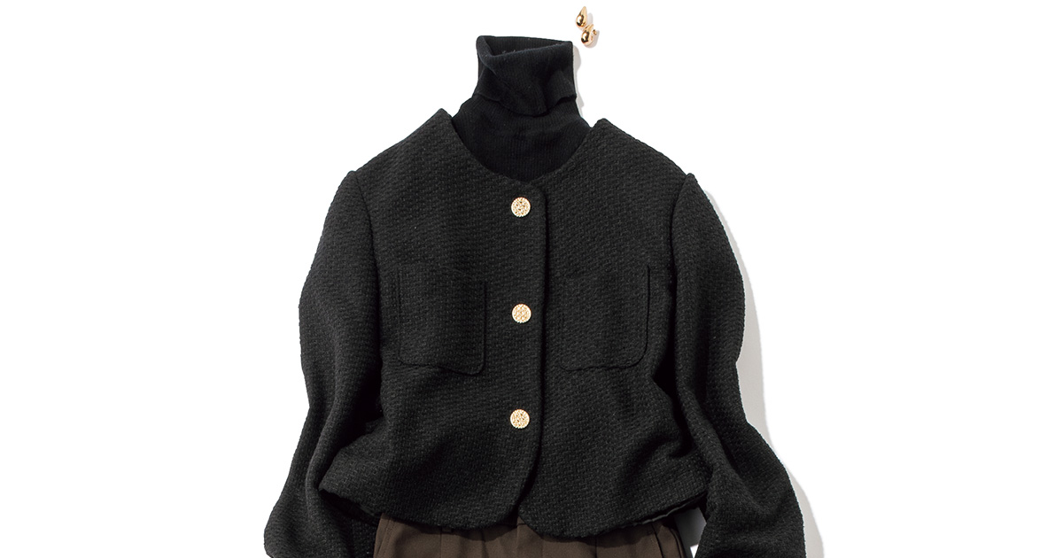 旬なワイドパンツを主役に黒のコンパクトなジャケットをオン。さりげないAラインシルエットでダークトーンでも柔らかい印象。
