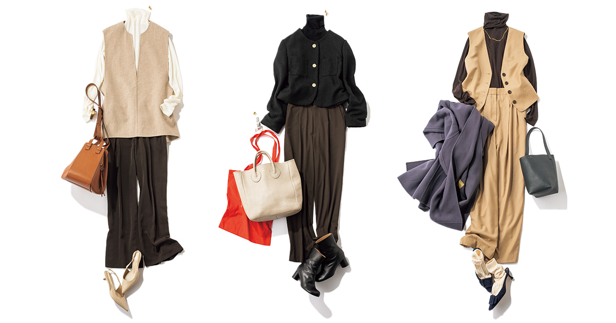 旬なワイドパンツを主役に黒のコンパクトなジャケットをオン。さりげないAラインシルエットでダークトーンでも柔らかい印象。