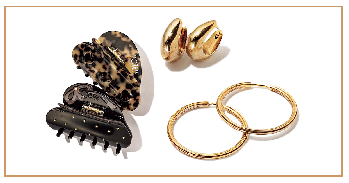 「通勤はまとめ髪が多いので、ぽってりフォルムで存在感のあるピアスと細身のフープピアスは必需品。顔まわりをモードにしたい日はトムウッド、エレガントに仕上げたい日はマリア ブラックと使い分けています」(井山かおりさん)