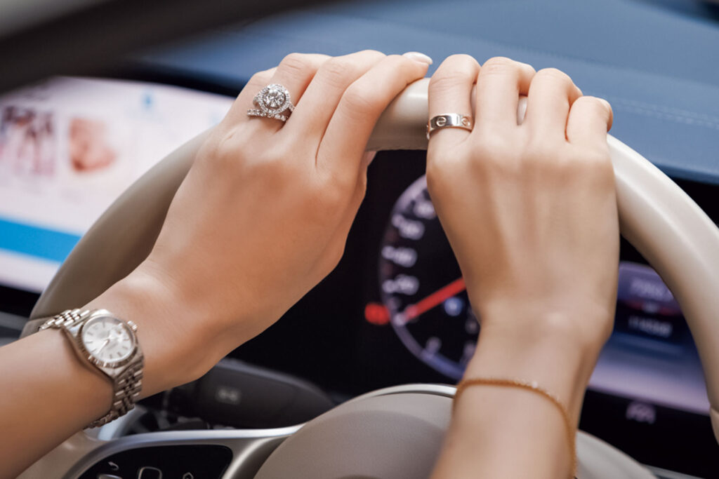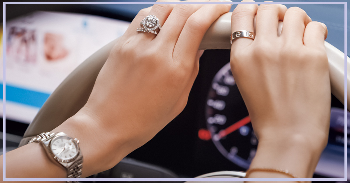 薬指に重ねてつけた時のバランスまでこだわって一からデザイン、オーダーしたエンゲージとマリッジリング。一生を共にしたい大切なリングです。右手の人差し指にはカルティエの「LOVE」リングやエルメスのシルバーのリングなど、ボリュームのあるものを合わせて全体のバランスを取ります。
