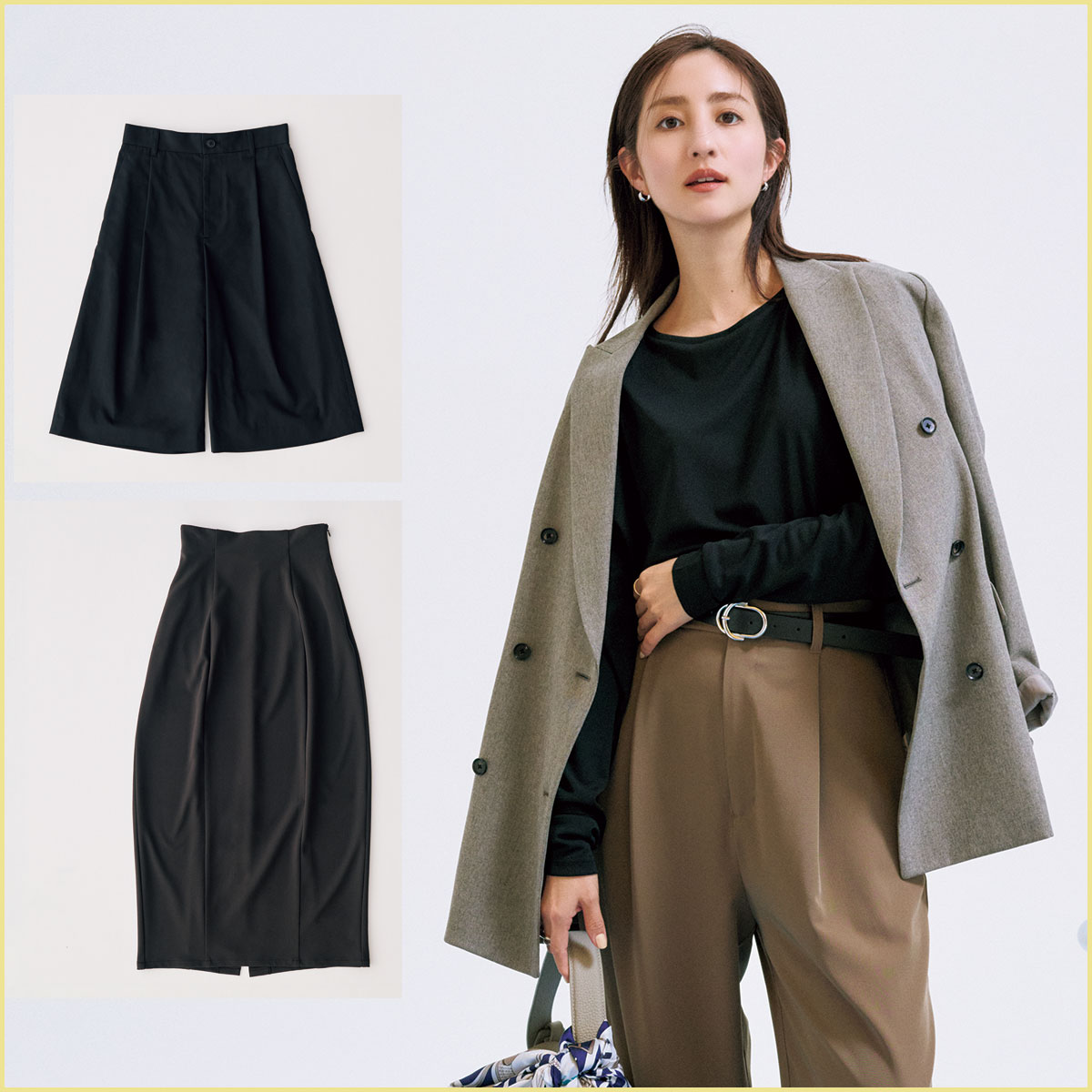 ウエストマークできる細ベルト付きで、スーパーワイドでも美しいメリハリラインが実現。パンツ¥28,600(アンクレイヴ/オンワード樫山 お客様相談室)
