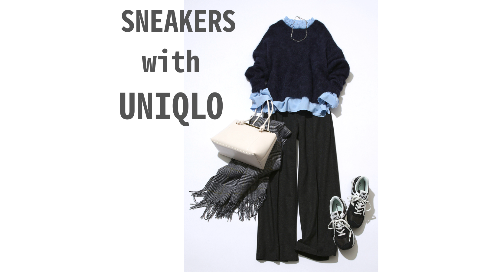 ニット「スムースコットンクルーネックセーター」¥3,990〈UNIQLO : C〉パンツ「タックワイドパンツ」¥3,990〈UNIQLO〉(ともにUNIQLO)ブラウス¥8,998(NATURAL BEAUTY BASIC)バッグ¥42,900(トフ & ロードストーン)パンプス¥17,600(ダイアナ/ダイアナ 銀座本店)ストール¥8,990(アンフィーロ/オンワード樫山)めがね¥14,900(JINS/JINS カスタマーサポートセンター)ピアス¥18,700(チビ・ジュエルズ/チビジュエルズ・ジャパン)バングル¥22,680(アビステ)