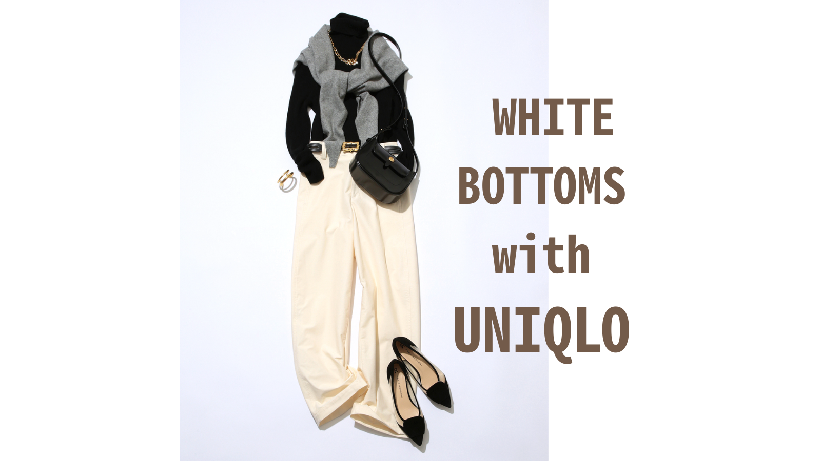 ストライプシャツやジャケットなど、きちんと見えアイテムを軸にしつつ、ゆるふわセーターの肩掛けで抜け感を出して。リラクシーなアイテムを一点投入すると、こなれた通勤コーデが完成します。小物は服の色味に合わせると統一感が出て◎。タックワイドパンツやセーターもユニクロのもので、¥4,000以下で手に入ります!