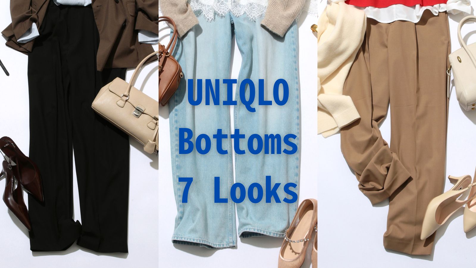 トップスと同じくユニクロのベージュのタックワイドパンツとインナーのシャツ、メガネなどの知的なアイテムを合わせると上品でトラッドば通勤スタイルが完成。バッグやパンプスなどの小物は、「赤×ベージュ」の邪魔をしないホワイト系で統一。