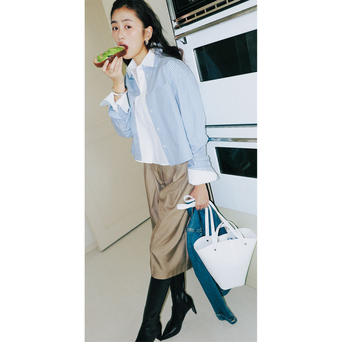 白シャツにストライプのショート丈シャツを重ねたレイヤードで、定番アイテムを今どきのバランスに刷新。コンパクトな丈感がウエスト位置を高く見せ、高バランスに仕上がります。ハーフパンツとロングブーツの組み合わせで、トレンド感のある大人カジュアルが完成。
