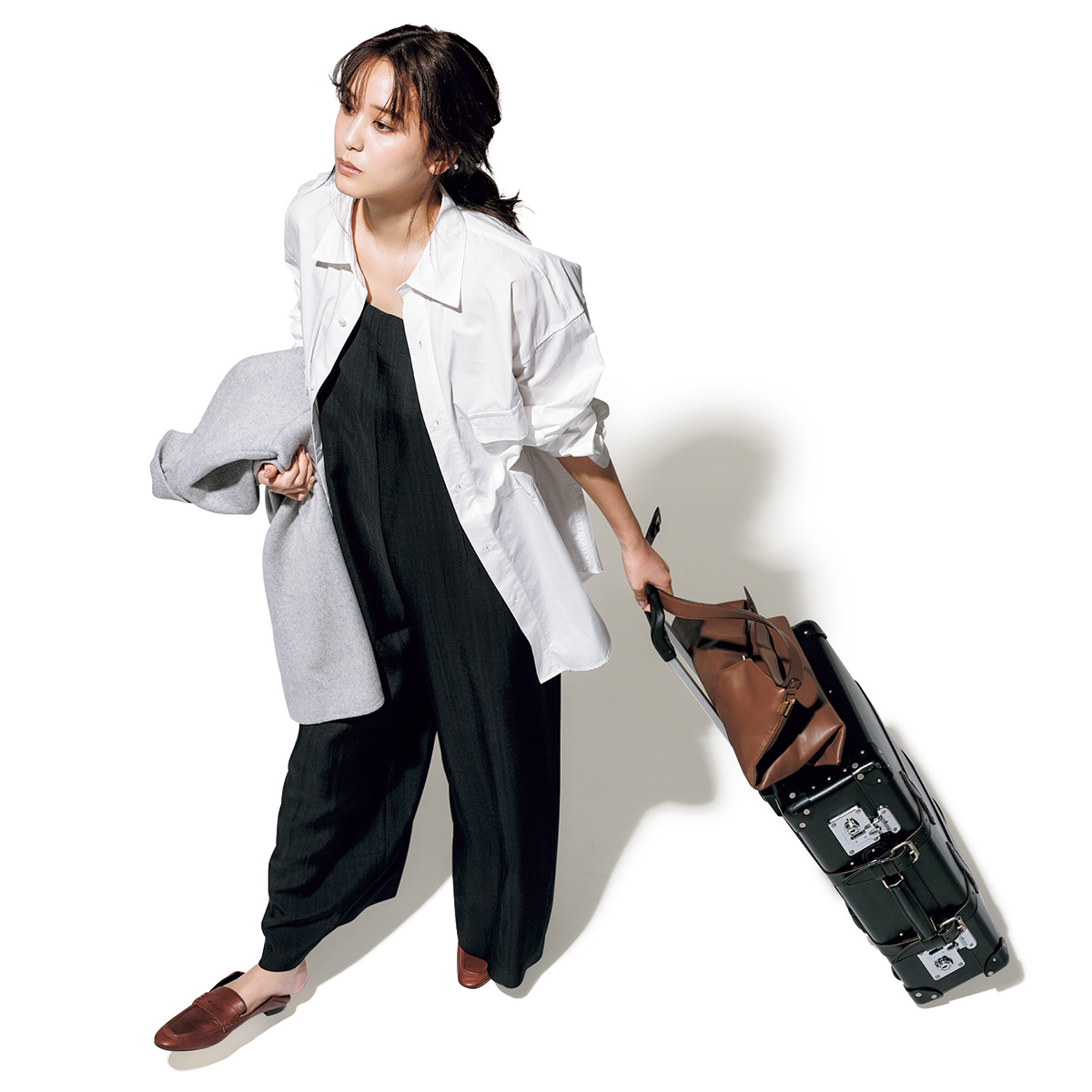 清潔感のある白シャツは普段使いはもちろん、出張や旅先でも頼れる存在。黒のオールインワンにさらりと羽織るだけで、モノトーン配色が軽やかな印象に。ゆったりとしたシルエットのシャツが、シンプルなコーデにほどよい抜けを添えてくれます。