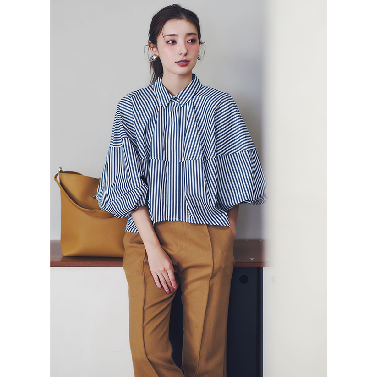 立体感のあるバルーンシルエットとストライプの切り替えが目を引くシャツは、一枚で着映える主役アイテム。ブラウン系のパンツを合わせることで、爽やかなストライプがほどよく落ち着き、大人っぽい配色に。存在感のあるデザインでも上品にまとまり、オフィスでも休日でも活躍してくれそう。