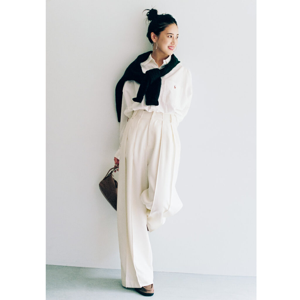 永遠の定番ともいえるポロ ラルフローレンの白シャツは、白のワイドパンツを合わせたワントーンコーデでクリーンに。リラクシーなシルエットでもゆるく見えすぎず、端正さをキープできるのが魅力です。肩に無造作に巻いたニットやラフにまとめたヘアでほどよく力を抜けば、真面目になりすぎない洗練スタイルに。
