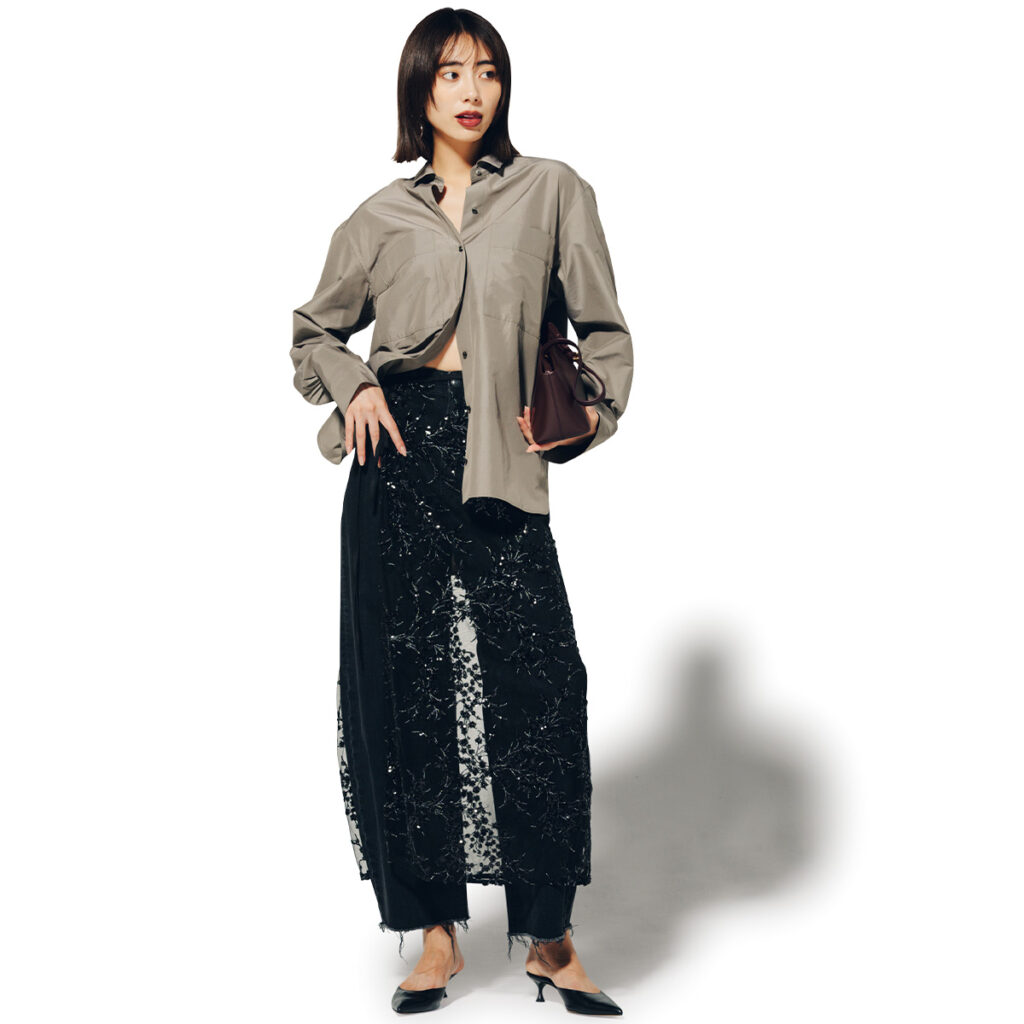 シックな発色のシャツは、トレンドアイテムに挑戦したいときの受け皿として活躍。レースのラップスカートを重ねた華やかなスタイルも、シャツの落ち着いたムードが全体を引き締めてくれます。パンツとラップスカートを同色にすることで統一感が生まれ、大人っぽく決まるのもポイント。