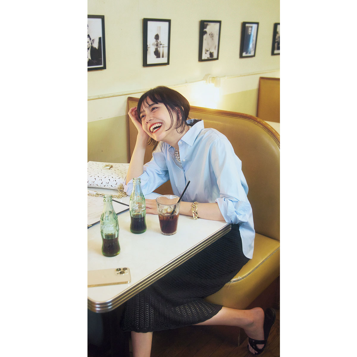 繊細なレーススカートに、あえてメンズライクなブルーシャツを合わせて甘さをセーブ。テイストのコントラストが生まれることで、レースの女っぽさがより際立ちます。爽やかさときちんと見えを両立した、デートにもぴったりのスタイルに。