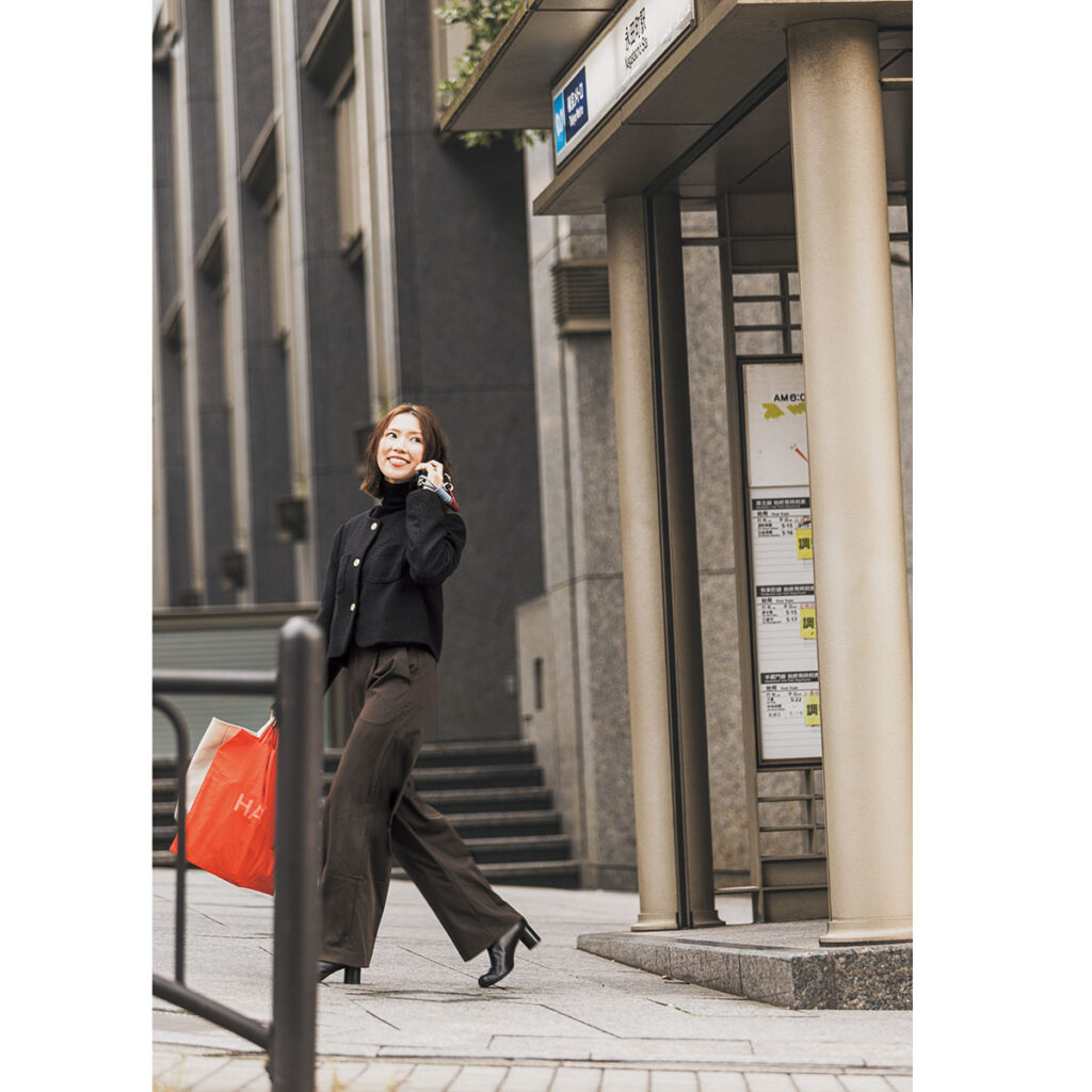 六本木のグローバル企業でマーケティング職を務め、フットワークの軽さはピカイチ。自由な社風やオフィスの土地柄に合う、カジュアル感ときちんと感を両立したブラウンコーデを実践中。