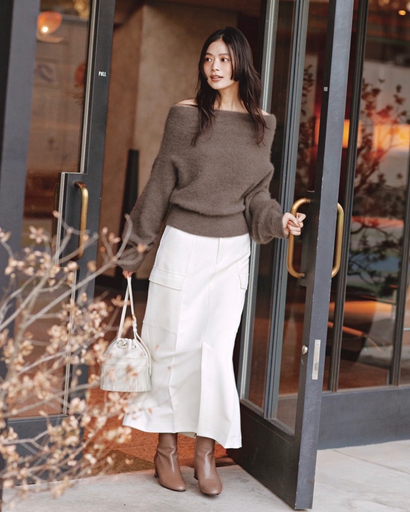 3月9日(月)、上質なラクーンニットは、コーデ全体の上品さを引き出してくれるアイテム。オフショル風のネックラインで、春らしい抜け感もひとさじ加えて。ボトムスはカーゴポケット付きの白スカートだと、軽やかさを演出しつつ、甘すぎないアクセントに。足元はブラウンブーツでニットと色をつなげば、統一感のある配色になります。