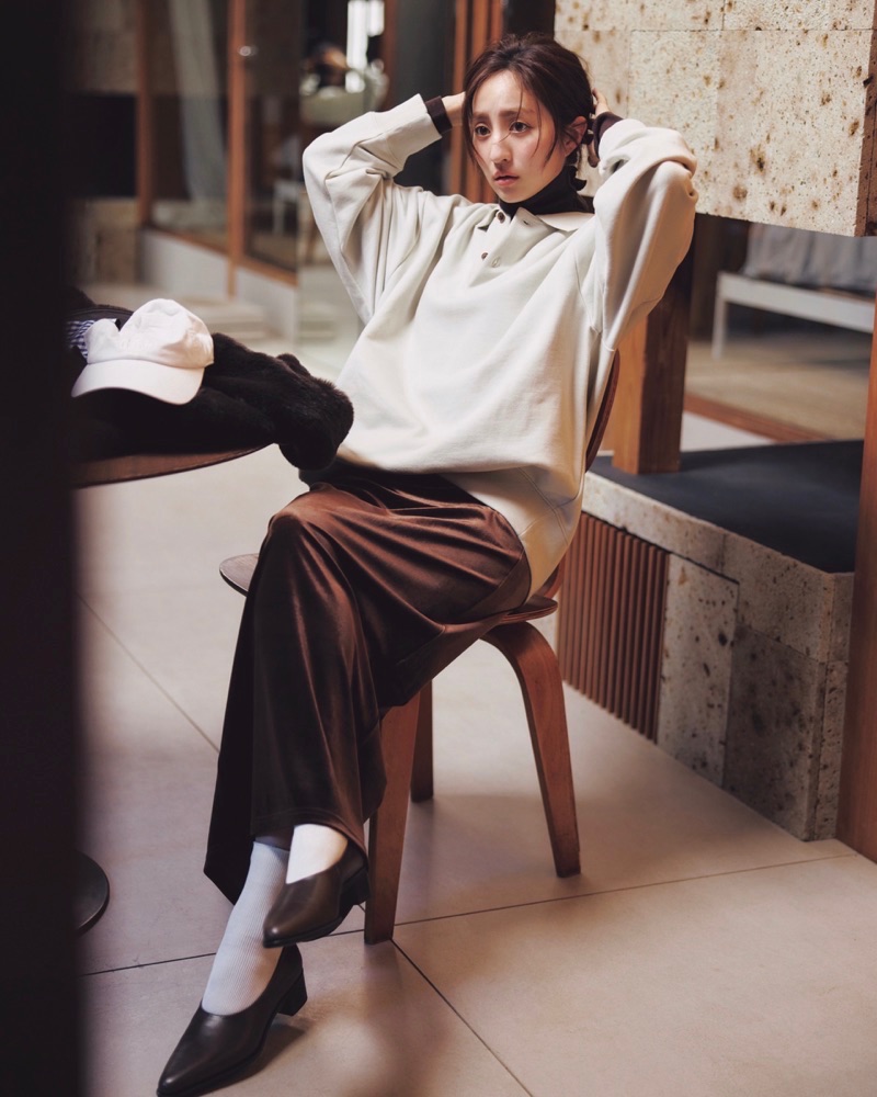 ポロスウェット(メンズ)※一部店舗限定¥9,990手に持ったジャケット※オンライン限定¥29,900キャップ¥2,990(すべてGap)中に着たタートルニット(メンズ)¥3,990(ユニクロ)スカート¥9,900(ユジーヌ/ジーンズファクトリー 卸団地本店)テーブルに置いたバッグ¥17,600(SEA/エスストア)パンプス¥63,800(カチム)ソックス(スタイリスト私物)