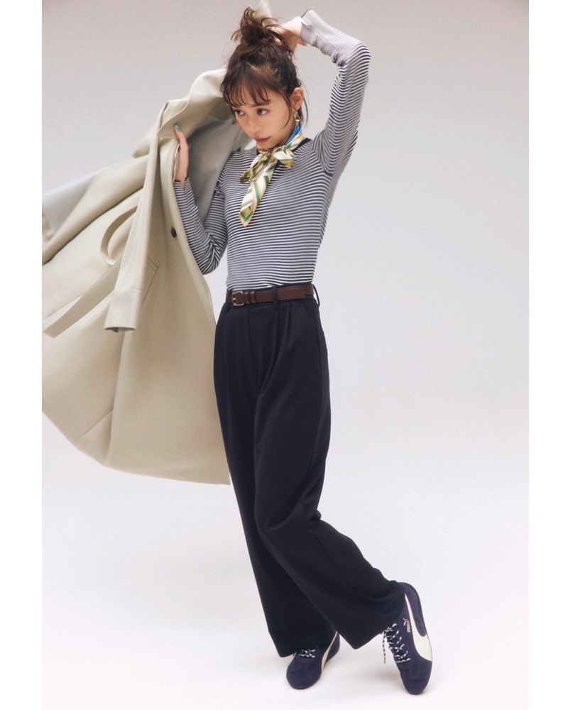 3月18日(水)、細ボーダーのタートルカットソーに、きれいめワイドパンツもネイビー。さらにスニーカーもネイビーと、一色でまとめると、いつものフレンチシックもワンランクこなれて見えます。そこにスカーフで顔まわりに彩りを添えれば、ベーシックな着こなしがぐっと華やいで。シンプルなのにこなれて見える、大人のフレンチシックコーデです。